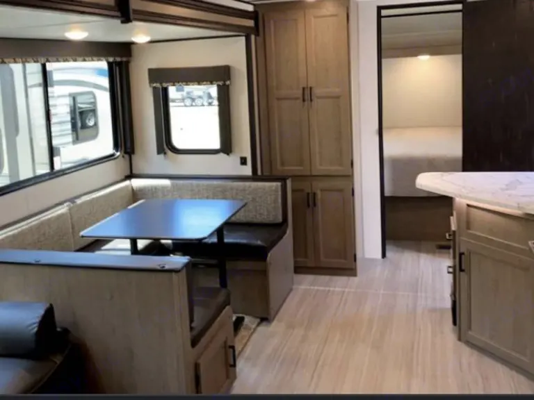 Hamburger Hideout is a beautiful 2 year old travel trailer. This rig comes with lots of sleeping space with the ability to sleep up to 10 people. There is a queen bedroom, bunk beds with 2 full sized beds, a pull out couch and a dinette that can be made into another bed. It come equipped with an electric Jack and stabilizers to make your life much easier. The living area comes with a large 50 inch tv and a fireplace for those nights you want to stay in. Another added bonus is the outside burner stove, fridge and shower. This beauty is ready for your next adventure. Ce qui est inclus4 camping chairs, towels and linens, coffee maker, dishes, pots and pans, and utensils. RecommandationsHamburger hideout can go anyway as long as the campground can accommodate the length. This rig is 33 feet so make sure to double check. We love taking it to the mountains, the beach and the desert. Autres points à signalerNo smoking