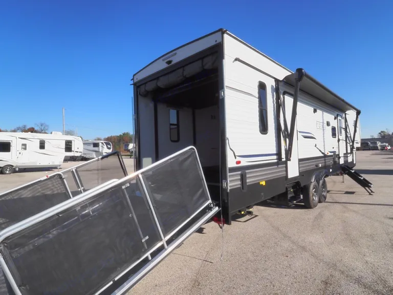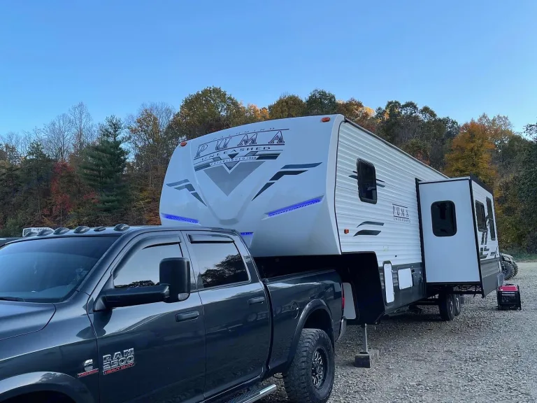 2021 Palomino Puma 382THS. Beautiful toy hauler if you're looking to camp out and bring along your motorcycle/golf cart/ or side by side! Will sleep 6-8 people comfortably. Has three queen beds, convertible dinette, and a fold out sleeper sofa. Indoor and outdoor shower. The garage area is separate from the living area. AC and heat work great! Has an onboard fueling station that hold up to 25gallons of fuel. Has an outside shower & outdoor propane hookup for grilling. Does not have an onboard generator. Full hookup for electric/water/sewer. Has a 100 gallon freshwater holding tank. Also has a patio deck for the back door. Everything you could possibly want!Ce qui est inclusFresh linens