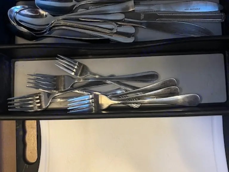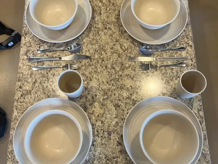 Cooking pots, kitchen knifes, cutlery set, plates, cups, bowls, and complete kitchen cooking utensils