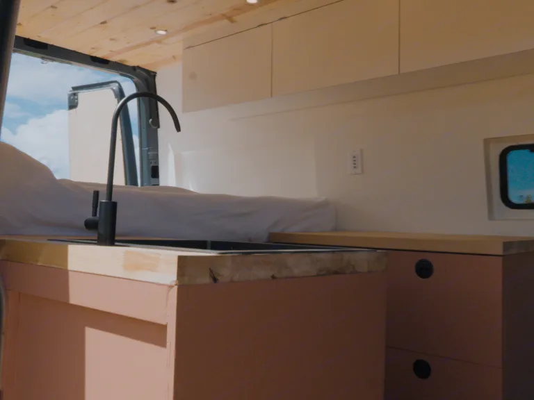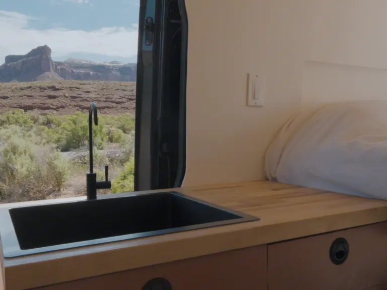 - House battery powers lights, fan, fridge, sink, USB outlets