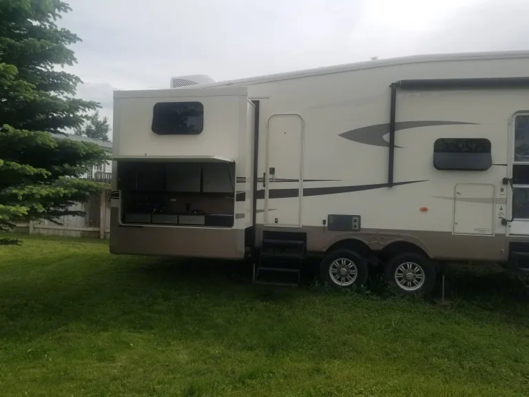 Youll enjoy 2 bathrooms, 3 TVs, surround sound/zones, 2 entrances, residential sized refrigerator and micro, Outdoor kitchen makes cooking and grilling a ton of fun, cozy up next to rhe fireplace and even sweep the kitchen using the central vac!!! We do even have a washer and dryer included... This easy to love 5th wheel includes 4 bump outs to create fun spaces for everyone to spread out and feel at home. We have dual AC units for front and back zones, a self cleaning black tank is very convenient as well. This unit is self-leveling to ensure proper set up!
