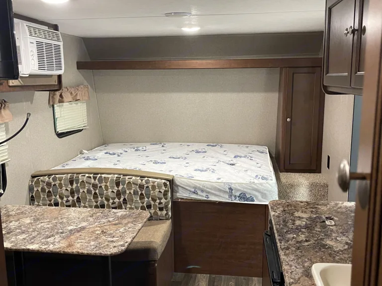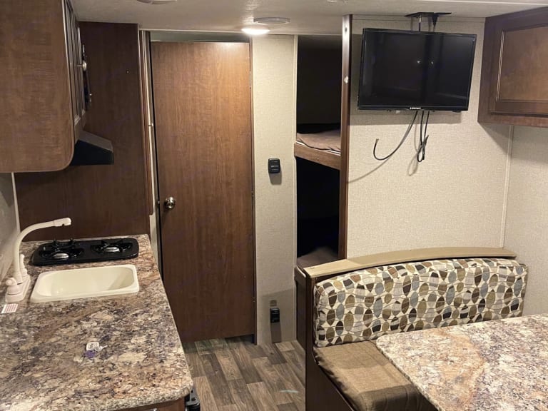 This is a great little lightweight camper set up to sleep 5. This camper is very clean inside and looks almost new. It does have a few hail dents on the outside but it works great. Book now to starting making family memories! Camper comes equipped with stove top but does not have an oven.Ce qui est inclusKitchen Supplies