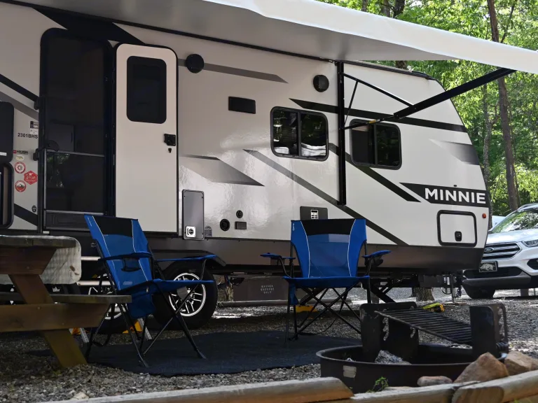 30’ travel trailer in excellent condition. 30/50amp service compatible with solar panel and battery. Dual propane tanks. Premium Wilderness standard queen mattress. A/C. Two bunks. Dinette seating. Rear bath with shower. Indoor kitchen with sink, gas cook top, microwave, and fridge. Outdoor kitchen with sink, griddle and mini fridge. Electric awning. Indoor/outdoor speakers w/ BT JBL cube. TV.Ce qui est inclusFresh linens for queen, pillows, bath towels, toilet paper, paper towels, dishes, flatware, drinking glasses, coffee maker, basic spices, camping chairs, outdoor carpet, outdoor cook table, mini Weber charcoal grill, Coleman dual burner propane stove for outdoor cooking.RecommandationsChoose your camping spot for eligible drivers to tow or camp locally by making your reservation at one of the nearby campgrounds where set up is offered. Contact owner for more information.Bring your camera because layers of blue ridged mountains surround you and are visible from every viewpoint. Amazing sunsets abound in these mountains!!If you choose to camp nearby in North Georgia or western North Carolina, beautiful Lakes Nottely, Blue Ridge, Hiawassee and Chatuge are nearby with swimming areas, playgrounds , hiking trails, picnic tables, and an abundance of wildlife such as eagles, deer, turkey, etc. Bring your own boat and launch at nearby boat ramps Or INQUIRE WITH HOST about pontoon boat rental and details.The Ocoee and Natahala rivers are within an hour drive if you’re into whitewater rafting or kayaking. Multiple lake and river fishing locations. Plenty of additional hiking opportunities, including the Appalachian and Benton MacKaye Trails.The towns of Blairsville, Blue Ridge, Hiawassee and Murphy, NC are all within 30 minute drive. Fine dining, concerts, festivals, wineries and breweries await for more entertainment!Autres points à signalerDelivery Available - Local Only 30512, 10 mile radius (Poteete Creek Campground or other nearby locations)Well qualified/verified drivers ONLY considered for towingMessage host for more details on delivery and towing.Hosts have an Old Town canoe and sit on top kayaks available for rent.Absolutely NO smoking inside. Our preference is for most cooking to occur outside