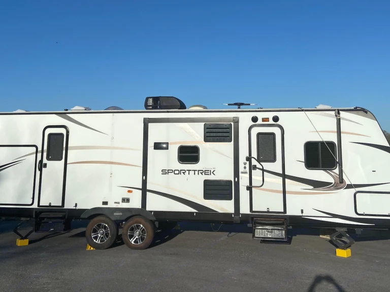 Welcome to your ultimate getaway on wheels! Our 2017 SportTrek Venture RV is the epitome of comfort, style, and convenience, ready to make your next outdoor excursion unforgettable. Whether you're planning a weekend retreat or an extended road trip, this RV has everything you need for an amazing experience.Features:Spacious Interior: Step inside and be greeted by a spacious and tastefully designed interior that comfortably accommodates up to eight people. With ample seating, sleeping arrangements, and storage space, everyone can relax and enjoy the journey.Fully Equipped Kitchen: Prepare delicious meals on the go with the RV's fully equipped kitchen. It features a refrigerator, stove, oven, microwave, and ample countertop space, allowing you to cook your favorite recipes wherever you roam.Entertainment Options: Stay entertained during your travels with the RV's entertainment system, including a flat-screen TV, and stereo system. Whether you're watching movies, listening to music, or playing games, there's something for everyone to enjoy.Comfortable Sleeping Arrangements: After a day of adventure, retreat to the cozy sleeping quarters. The RV offers a comfortable queen-sized bed in the master bedroom, bunk beds for the kids, a dining conversion bed, and 2 convertible sofa beds, ensuring a restful night's sleep for everyone.Outdoor Living: Embrace the great outdoors with the RV's outdoor living features. Relax under the awning while enjoying a meal cooked on the exterior grill, or gather around the campfire for s'mores and stargazing.Convenient Amenities: This RV comes fully equipped with all the amenities you need for a hassle-free trip, including a bathroom with shower, air conditioning, heating, and ample storage space for your belongings.Ce qui est inclusIncluded in the camper:Bed linens for the queen size bed
