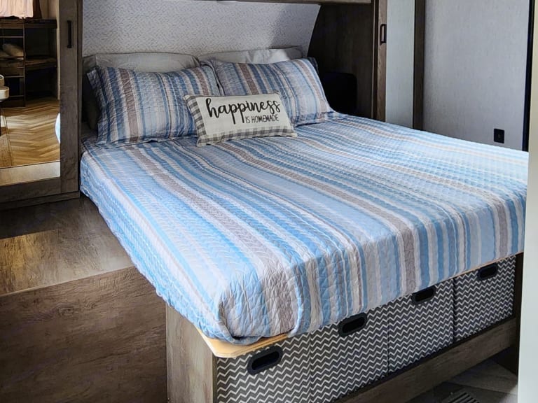 You just need to bring your clothes, food and personal care items.!!!! Special Promo!!! We are offering special price to get the rentals rolling and to build up our reviews and profile. $10 off per night for a brand new travel trailer, you must take advantage of this !!!!!Lots of fun for kids as they will feel in a complete adventure. Private master bedroom with a Full/Queen bed + small closet + many drawers and storage space around, above and also under the bed.