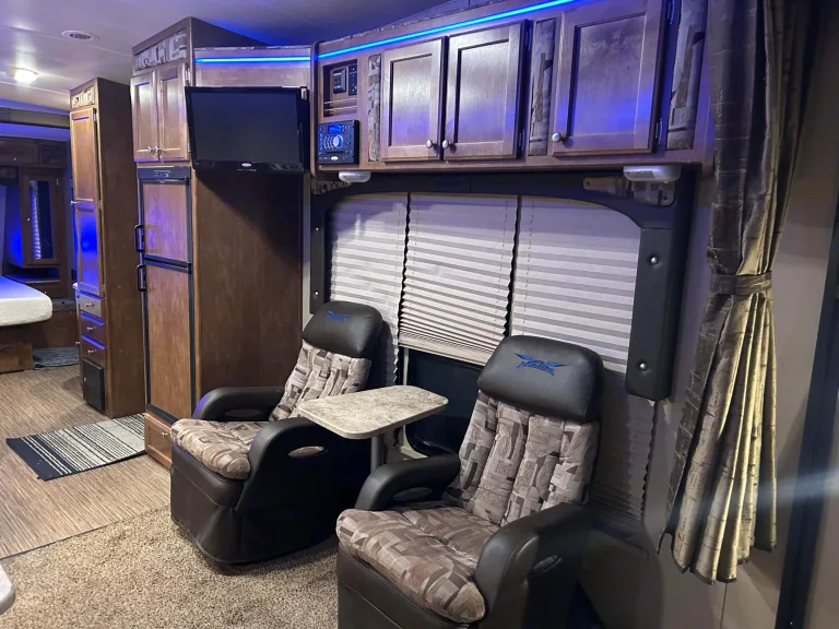 Retractable queen bunks create vast space for your toys, then transform for sleeping.