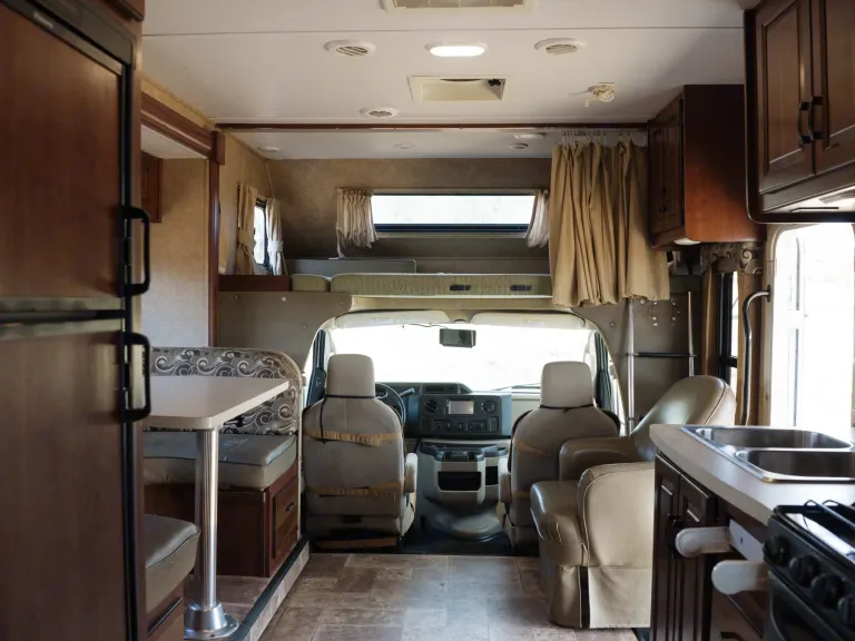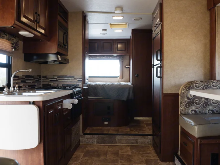 The Forest River Sunseeker 2450S Class C motorhome features a rear bedroom and a single slide.A rear private bedroom features a queen size bed with overhead cabinets along the head and side. There is room to mount an optional TV on the wall at the foot of the bed. There is a bathroom with private toilet and shower area along with a vanity sink just outside the bathroom. There is also a wardrobe and a combination wardrobe/pantry within the bedroom.The single slide houses a generous u-shaped dinette with overhead storage cabinets. A refrigerator is also located on the driver's side of this Sunseeker 2450S.Opposite the slide, the kitchen boasts a three burner range, overhead microwave, double kitchen sink, overhead cabinets and a flip down countertop. There is also a lounge chair along this side with a mount for an optional deluxe TV just behind it.The front of the motorhome features a 54" x 80" cabover bunk.