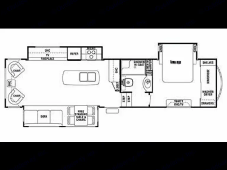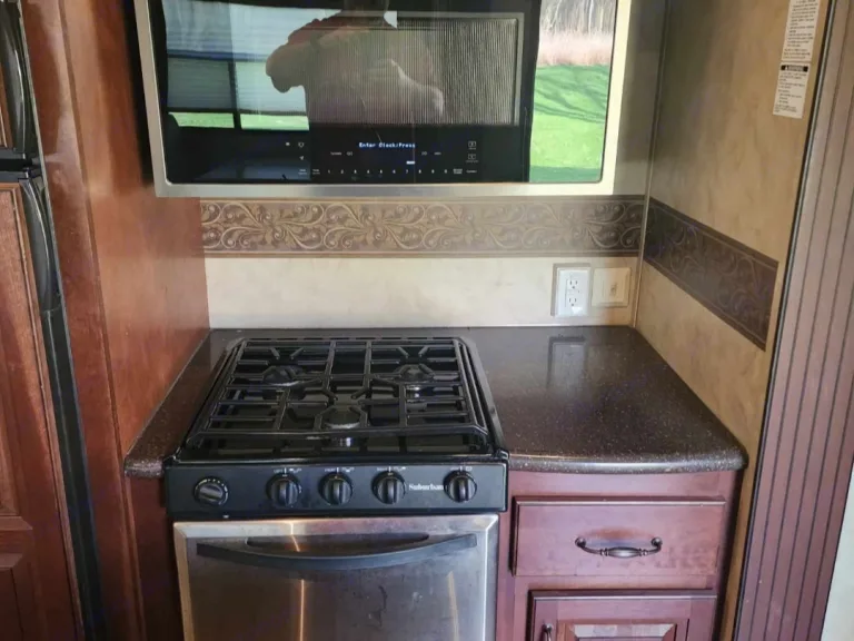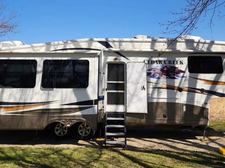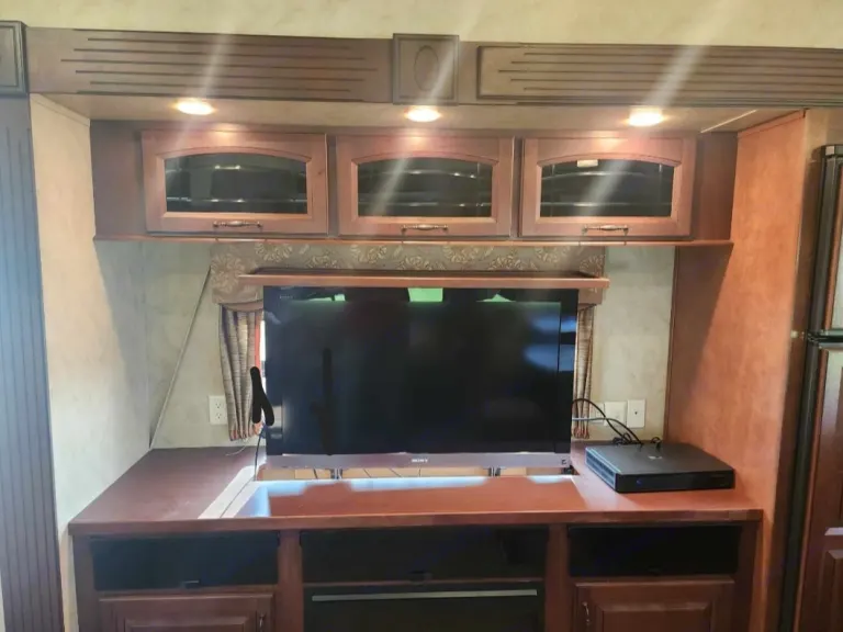 You'll feel like you're glamping in this lightly used, impeccably maintained and beautiful fifth wheel.This Cedar Creek 34Rlsa Fifth-Wheel Trailer has an expansive living area: 3 slide-outs, hardwood cabinetry, high-end fabrics & finishes. Large refrigerator, 3 burner stove, oven, microwave, double sink, freestanding dinette. Flat-screen TV, fireplace, DVD player, DirecTV receiver, premium sound system. Plush (never slept on sleeper) sofa, 2 recliners.Master suite w/king-sized bed and tons of storage. Ensuite bathroom w/spacious glass enclosed shower, vanity with sink, mirrored medicine cabinet, porcelain toilet.Efficient Hvac. Central vacuum system. Electronic leveling system.There are abundant storage options, including numerous cabinets, closets, and storage areas inside and out. Exterior has a 16ft powered awning.Clean and ready to go. Please bring your own linens. RecommandationsPlease bring your own linens. Autres points à signalerWe expect that you will return the camper in the way you found it.Pets welcomeNo smoking.
