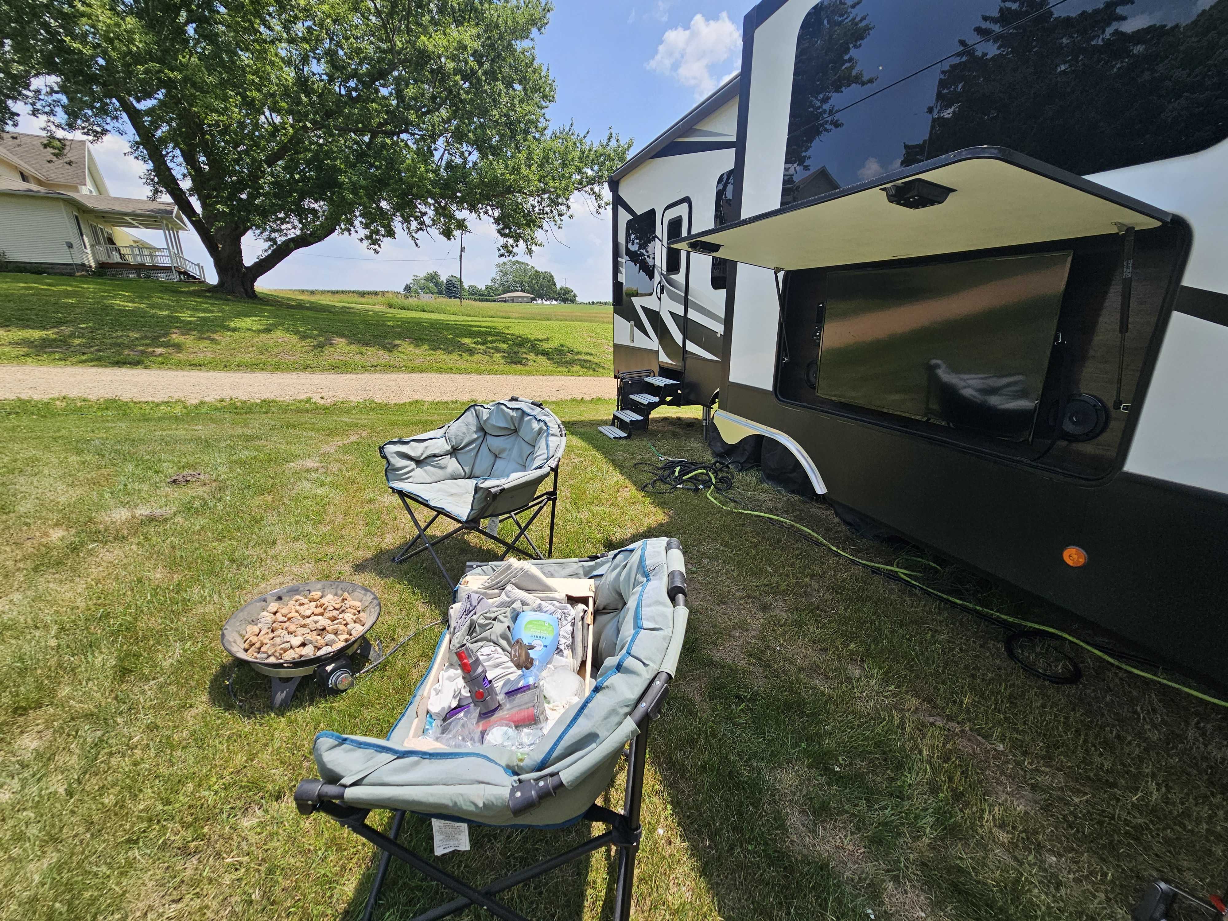 - Outdoor entertainment center: Watch your favorite movie at the end of a long day or blast your favorite tunes!Step inside our meticulously maintained, fully equipped toy hauler, and make your next journey truly unforgettable. Rent today, and let the adventures begin.Our RV is available as a stationary rental or with delivery. We handle setup for a worry-free getaway.