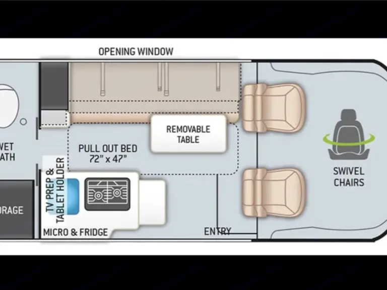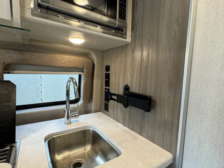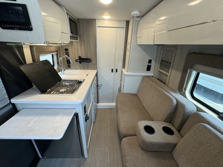 Functional Kitchenette: Equipped with a compact refrigerator, two-burner stove, and microwave for convenient meal preparation on the go.
