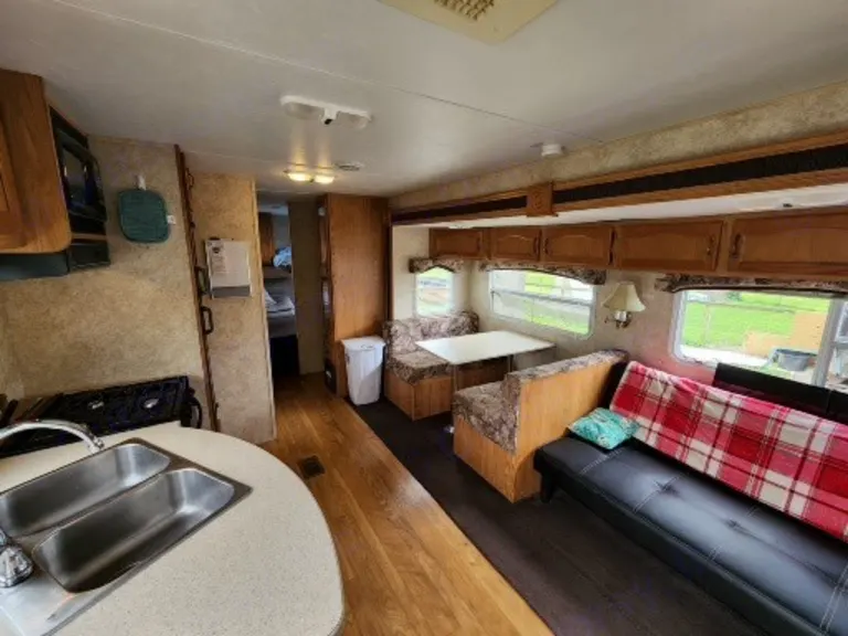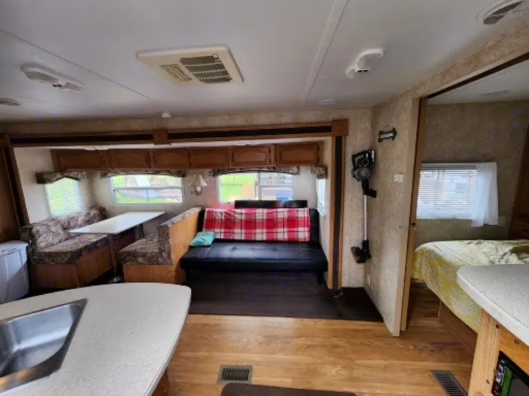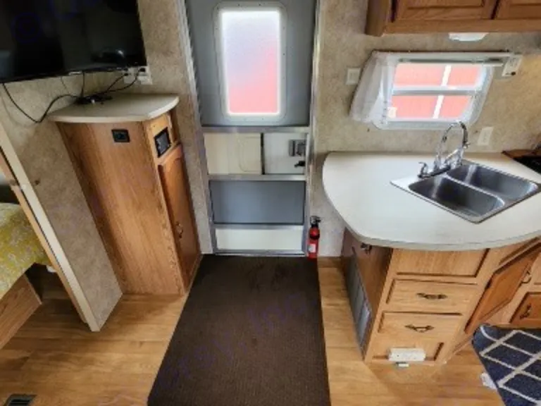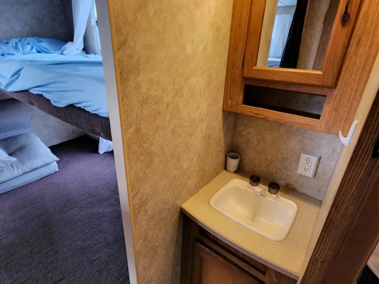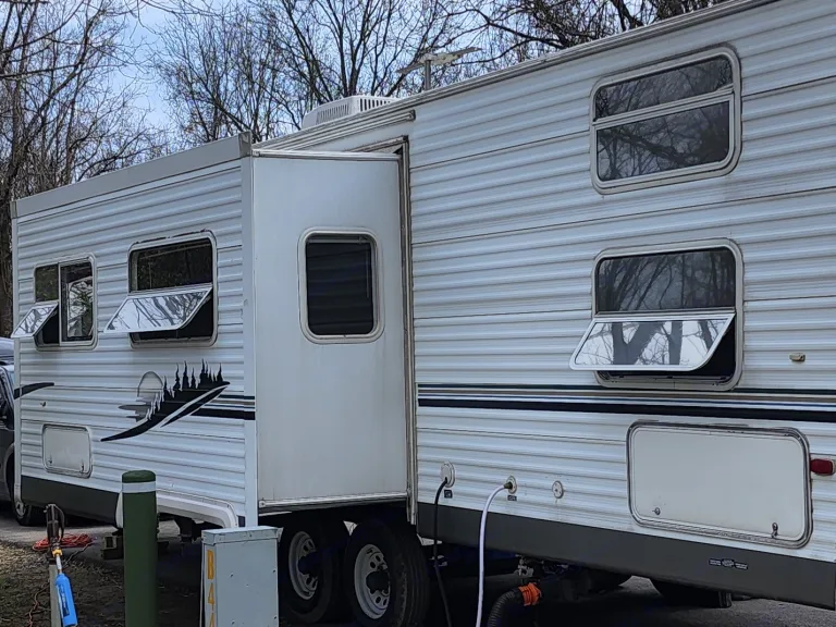 The camper is equipped with a 30 amp 120 volt 3 prong plug that can be pulled out from its storage compartment on the driver side of the camper just behind the slide out. The fresh water hook-up is just beside the storage compartment for the electric hook-up. Sewage hook up is just below the water hook up on the under side of the camper.