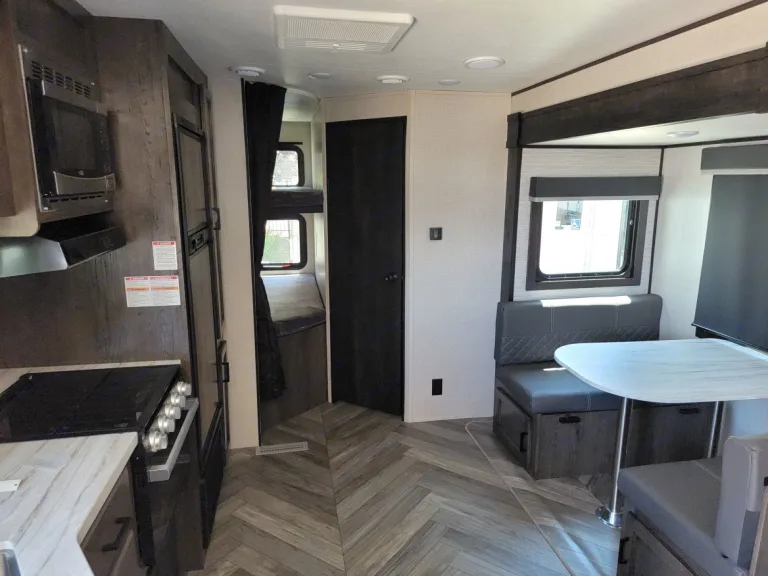 Family vacations or weekend getaways with friends just got sweeter in this spacious travel trailer. The large slide out in the main living area opens up the floor to let the kids play, while the chef of the group prepares lunch on the three burner range. If the weather is nice, you may want to cook on the outside kitchen that includes a grill and a refrigerator for cold drinks. After you've spent the day outdoors, you will enjoy having your own full bath that includes plenty of counter space and a medicine cabinet just like at home. Also includes LED TV and an AM/FM/Bluetooth radio with indoor/outdoor zoned speakers so you can listen to your favorite tunes, and the power awning with LED lights will create an outdoor living space your whole group will love. Inside, you'll find roller blackout night shades, queen bed, 2 double size bunk beds and if you need a little more sleeping space there is a jackknife couch and table that turns into a bed. Two A/C units plus a fireplace and many more comforts to make you feel right at home!Ce qui est inclusFresh linens, dishes, utensils, pots and pans, Kuerig coffee maker, outdoor grill.Autres points à signalerPlease NO pets and NO smoking. There will be an additional fee if violated.At least a 5 day rental for delivery if more than 30 miles away.Also, some festivals not allowed. BURNING MAN is NOT allowed. Please ask before booking.
