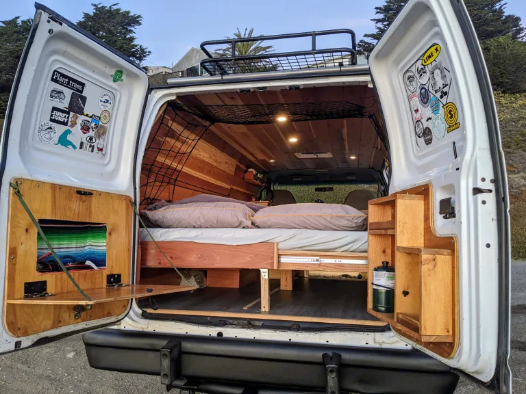 Redwood is a 2007 ford E250 extended cargo van that has been outfitted to meet any adventure you throw at it. Redwood has been fabricated with redwood interior to bring in that warm vibe and also a piece of the California coast. This rig comes with a couch and fold-out bed, sink with running water, stove-top with (2) burners, and all the cooking equipment you may need on your trek.The van also comes with onboard power so you can run laptops, batter banks, toasters, etc. Additional storage is available by utilizing the roof rack and is capable of holding 500 pounds of extra gear. Additionally, there is a yeti cooler to keep all your cold food cold, if you are not familiar with Yeti coolers then you will be impressed to find out that they hold ice for up to 4-5 days.This van is a beast and due to its aggressive tires and added lift, you will be able to find dirt roads and really go off the grid.Visit my website to see more Wildwoodvans. C o m Autres points à signalerNo smoking, please.