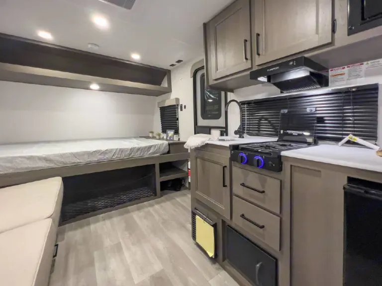 Check-In/Pickup time is 11:00 AM. Check out/ Return time is 11:00 AM. If you are looking to pick up a camper before 11:00 AM or have it delivered before 11:00 AM, you will need to select the "Early Pickup" add on when booking your unit. We will approve or deny the request based upon vehicle availability and preparation time. Unit return time is 11:00 AM. If you would like to return it after 11:00 AM, you would need to select the "late return option" and we will review the request to see if we can accommodate the late return.All of our campers kitchens are fully provisioned with essential cooking items.