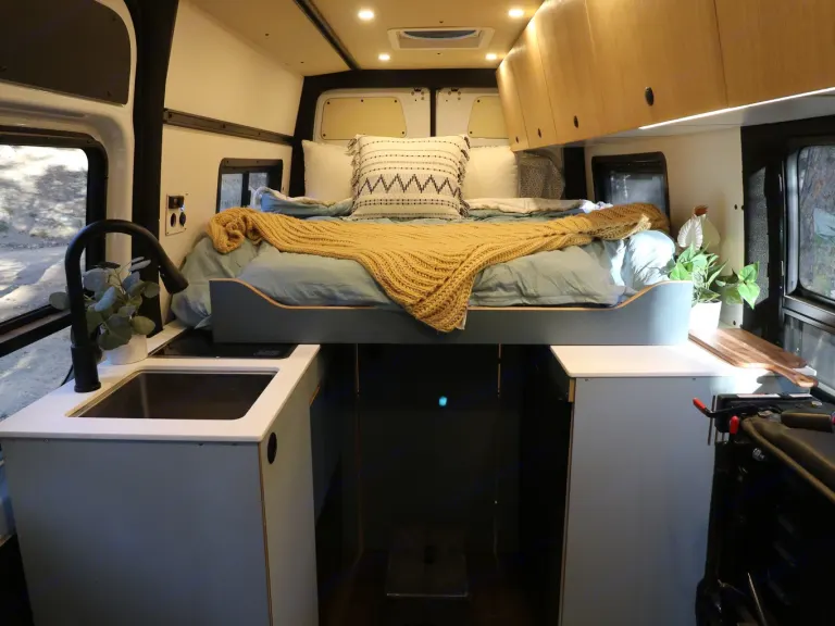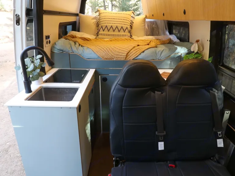 This van is completely off-grid capable! The camper system is powered by three 100Ah lithium batteries and a 2000-watt inverter that charge via solar panels, vehicle alternator charging, and a 15A shore power hookup. The water can be filled via a port in the back of the van using any standard garden hose. There is a built-in filtration system for the water. The gray water empties into two 5-gallon tanks and need to be dumped manually at any RV station.