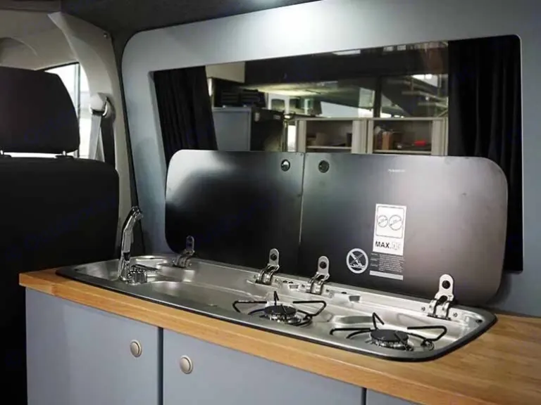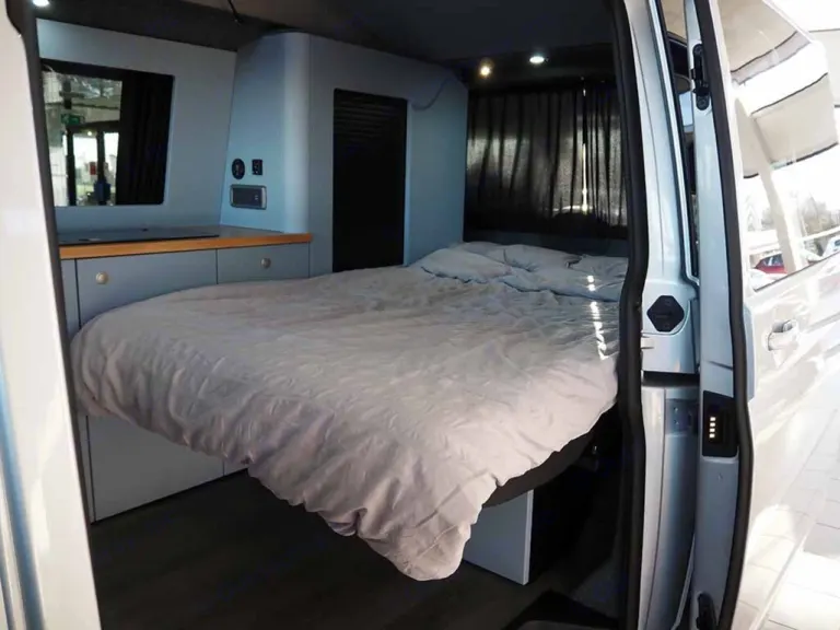 Genuine VW campervan conversion with a pop top roof. Enjoy the comfort of a modern campervan that has been fitted out with all the mod cons you will need for your camping experience including a full-width lower bed, stainless steel sink, and cupboard space plus table. A gas camping stove and electric coolbox to keep refrigerated are included.- Elevating roof- A free-standing table in place when required- Gas hob, fridge freezer, gas heating with built-in tank, Sink and external shower- 4 Berth (4 Seat Belts)- Small and compact camper for exploring villages- Reversing camera**Please note extras including extra driver, kitchen kit, bedding etc available on request