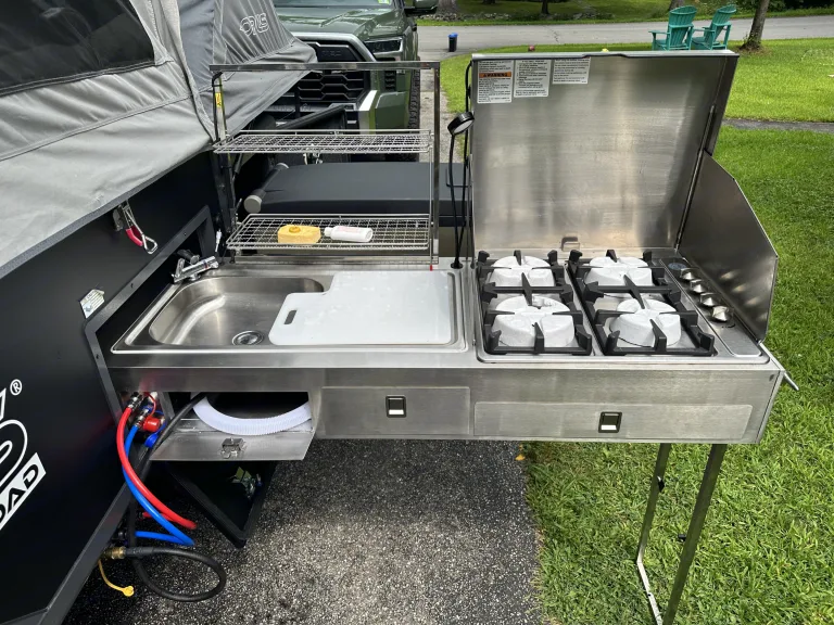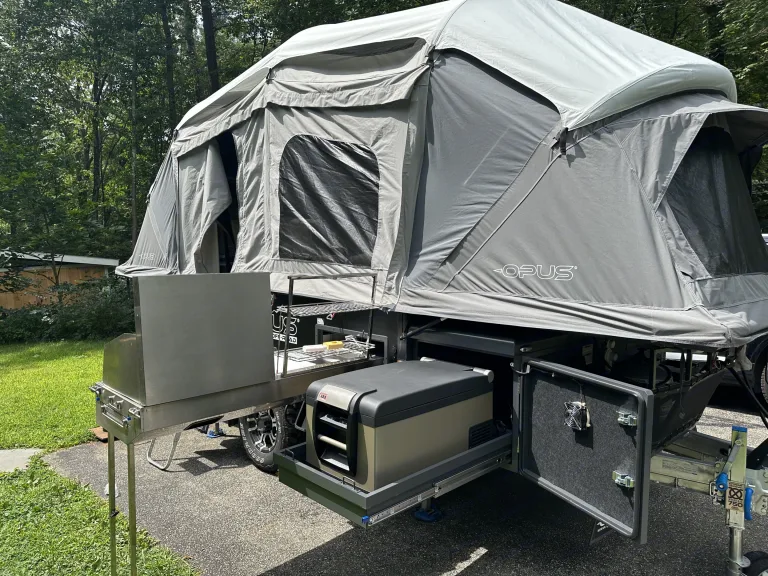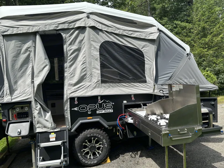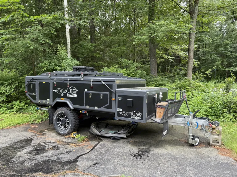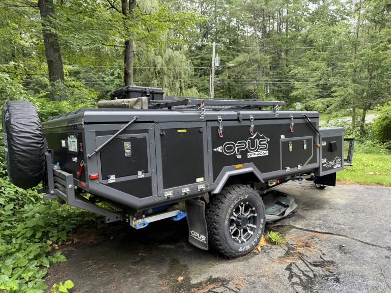 The go anywhere off-grid ready or just glamping-lite popup camper. True off road camper with high clearance mud tires and independent suspension. It has up to 40 gal. of fresh water supplying the kitchen and shower with on demand hot water if needed. The OP4 comes with 2 batteries that will last for several days depending on use. Also comes with onboard heater for use on those cold night or late season trips. The OP4 can sleep 6 in 3 double beds or fold the main bed and dinette area into a luxurious King size. Beats sleeping in tent in any condition. The OP4 is equipped with a kitchen that includes sink, and 4 burner stove. The OP4 onboard ARB fridge/fever for keeping things cool/frozen. Setting up and tearing down camp is easy, just flip the storage rack up, open both sides, turn on the air compressor to inflate the 8 ft tall ceiling. The fully loaded camper is approximately 4000 lbs (approximately 2900 lbs dry weight). This can be towed by full size truck or mid-size SUV/truck with a class IV receiver (2”x2”) can tow the camper. It does require tow hitch specific to the camper which will be provided.Ce qui est inclus-The camper will come with basic bedding, mattress covers and light sheet and camp blankets.