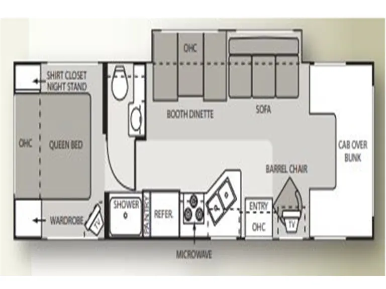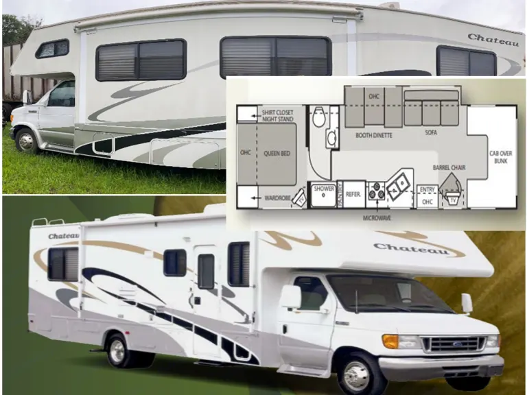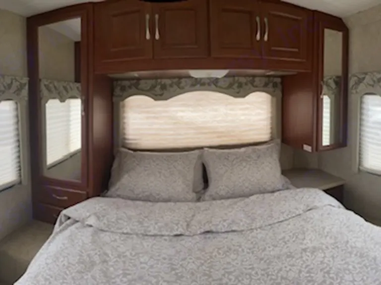 Bedding includes a private queen bed in the rear bedroom, and over cab queen bed, a convertible sofa and a convertible dinette. Sleeps 6 adults comfortably or can sleep 4 adults and 4 children.