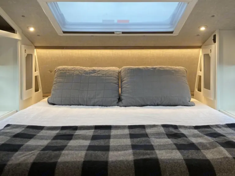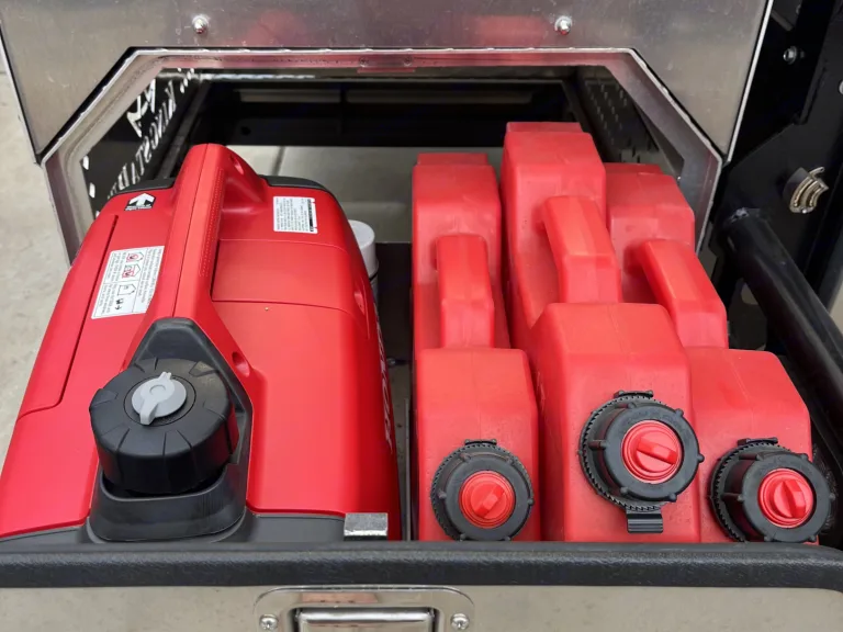 3×2 Gallon Gasoline Rotopax (fit perfectly with Generator in Weatherproof Locking Exterior Drawer Ce qui est inclus2x Camp Chairs, Camping Table, Fully Stocked Kitchen, North-South Queen Bed, 600 Watt Zamp Solar Kit w/ Victron Smart Solar MPPT 100/50 Charge Controller (Bluetooth), 3x100 Amp Hour 12 Volt Battle Born Lithium Batteries, Truma-Combi Eco Plus Hot Air+Water Heater, 5.3 Cubic Foot Vitrifrigo Refrigerator+Freezer, Dinette Style Interior (converts into bed, I’m 5’11, 200lbs and have slept fine on it), King Swift Omni-directional Wifi Booster, Drive Reach RV Cell Booster (folds away when not in use), Reico Titan Camper Jacks w/ Swing Away Dually Bracket, Skylight with Sliding Screen and Blackout Shade, Convection Microwave, Three-Burner Propane Cooktop, Fish and Ski Side Lockers, 32 Gallon Fresh Water Tank+2x15 Gallon Side Saddle Auxiliary Fresh Water Tanks (total of 62 Gallon Capacity), Rear Rack Pack with Tower and Locking Generator Storage Compartment, Sliding Airhead Compost Toilet w/ Switch Controller for Ventilation Fan (never smelly!), Honda 2200i Ultra-Quiet Inverter Generator and associated adapters/cables (Shore Power Cable, inverter adapter cable, etc.)