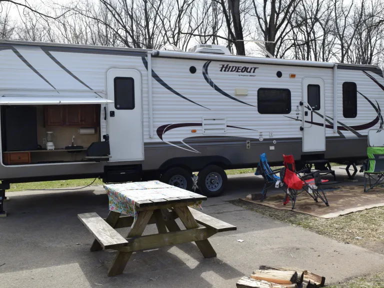 This 2013, 31 ft bunkhouse edition is perfect for a family get away, or a weekend with friends! She can officially sleep 10, but only 9 average sized adults. The master bedroom has a queen bed, with privacy curtains and the dinette and couch both turn into beds for overflow sleeping, but the best part of having a bunk house is that the kiddos will have their very own space! With its very own slide out, 2 top bunks and a fold out couch (that can be separated for 2 twin beds or pushed together for a king size) there is plenty of room! The bunkhouse also has its own storage, including a small nook, perfect for setting up a tablet or laptop so the little ones can watch their own movie on a rainy day.The indoor kitchen sports a microwave, coffee maker, fridge with freezer, small oven, a three-burner propane stove and is also equipped with a fully stocked kitchen, including place settings for 12, pots and pans, serving bowls, and serving utensils. If you prefer to cook over an open fire, we provide pudgie pie makers, and roasting forks, as well as cast Iron cookware upon request. Our Hideout also has an outdoor kitchen with its own mini fridge and stove, which is a huge bonus on those hot days!