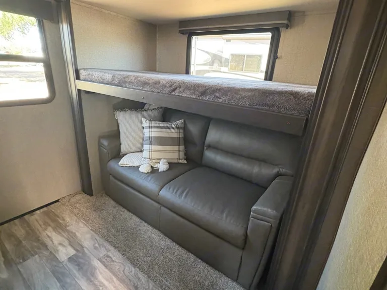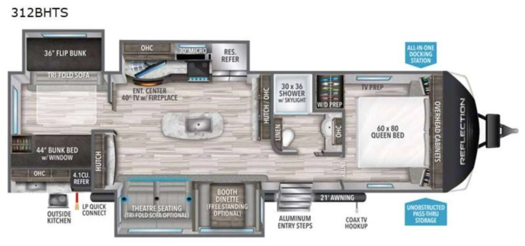 This 2021 Reflection 312Bhts awaits your adventure! The spacious home on wheels is perfect for families, couples, or anyone craving the freedom of the wilderness. It's 37 feet long and can sleep up to 9 people. It is pet friendly and offers delivery. The rental comes fully equipped. Dry weight is 8,800 lbs. Fresh Water Capacity is 60 gallons, Gray tank is 78 gallons and black water is 39 gallons. The rig has 3 slide outs and comes with an 18ft awning.Additional Details: