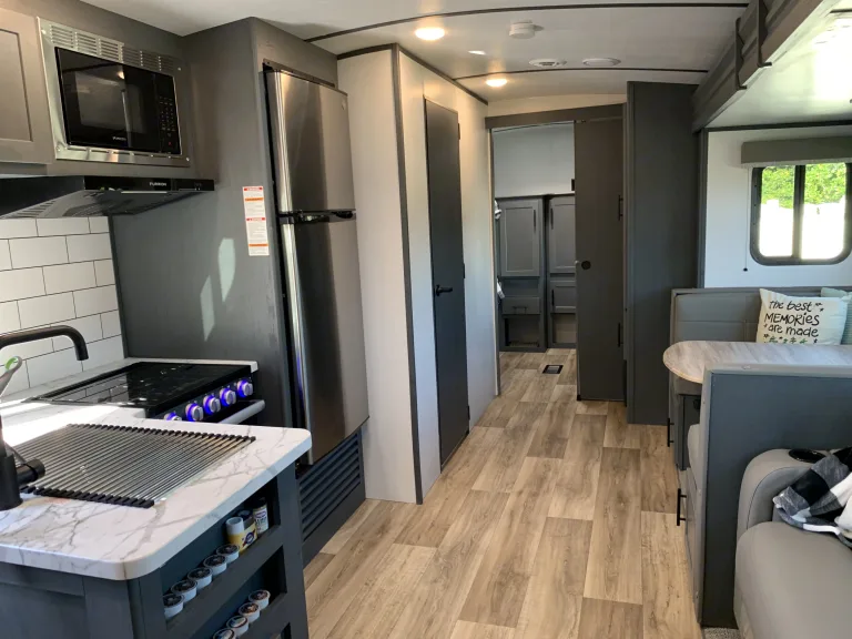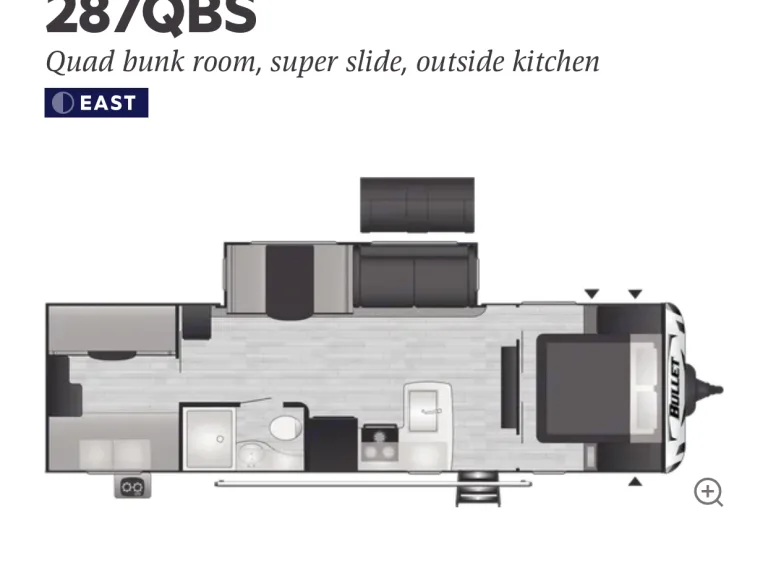 **Delivery Only** Hudson's Happy Camper is a new 2022 Keystone Bullet 287QBS travel trailer. Featuring a queen bed with upgraded memory foam mattress cover and a quad twin bunk room in the rear, there's plenty of room for you and the kids!Dinette also folds down into a bed, so sleeps 8 total. Beautiful modern finishes; Kitchen with large sink, microwave, stove, oven, large fridge/freezer; Bathroom with tub & upgraded Oxygenics shower head; Comfy couch that also folds out; Flatscreen TV and entertainment system that you can connect your phone to & play your music indoors or out! Power awning with LED lights and outdoor kitchen: fridge, 2-burner cooktop, and an electric griddle perfect for pancakes, hamburgers, hotdogs, etc.Hudson's Happy Camper also Includes everything you'll need for a great experience -