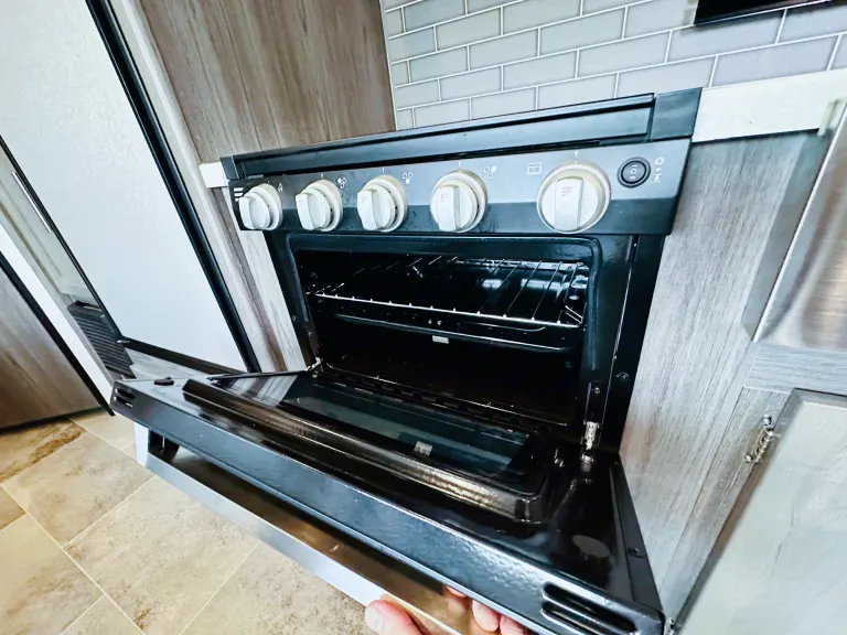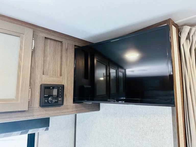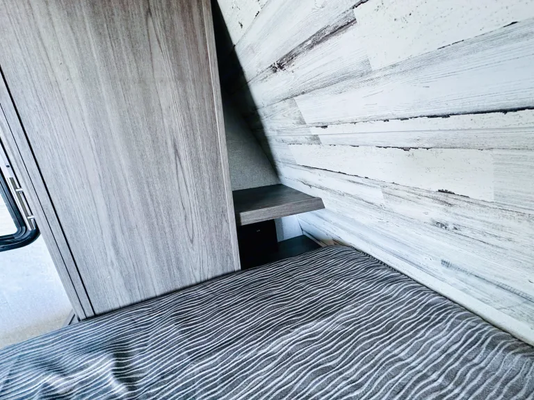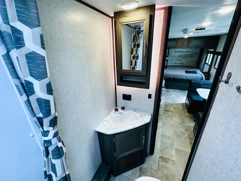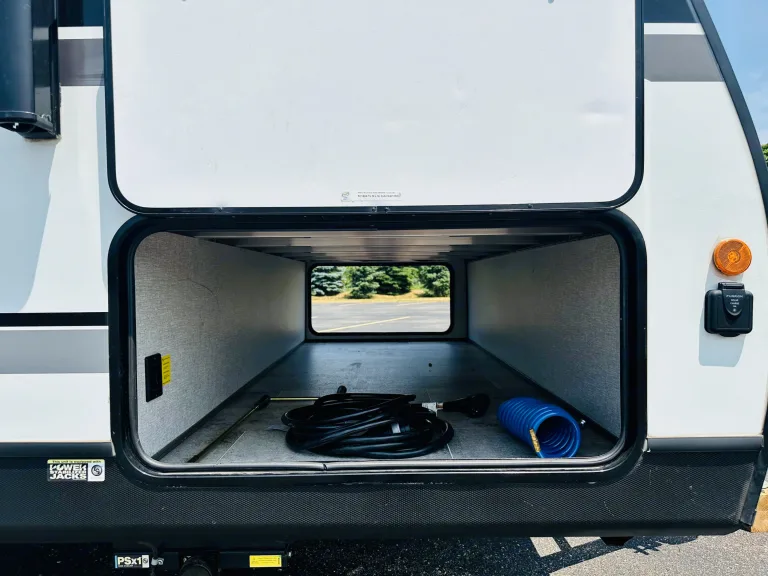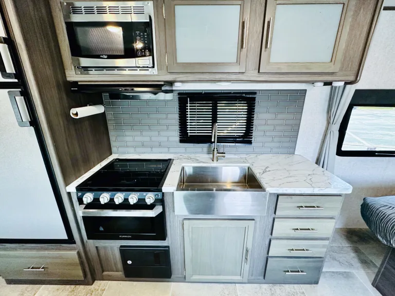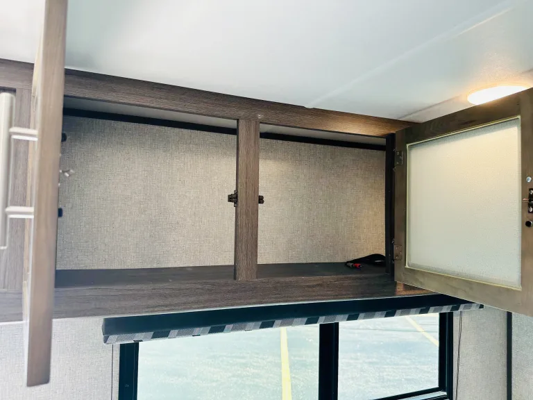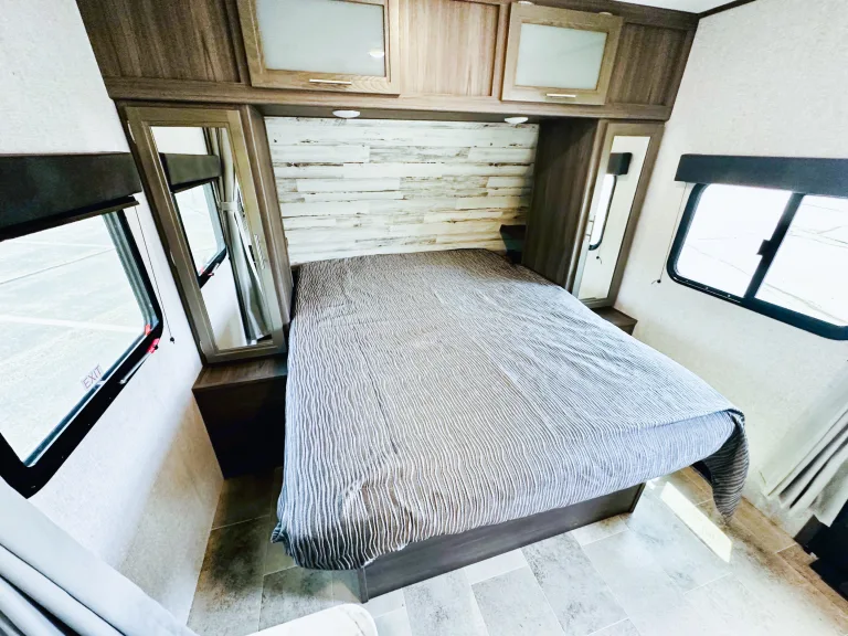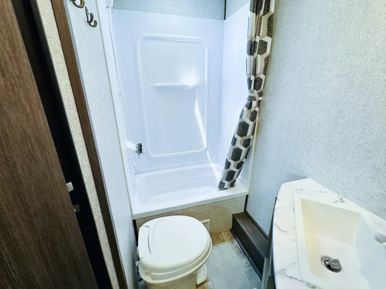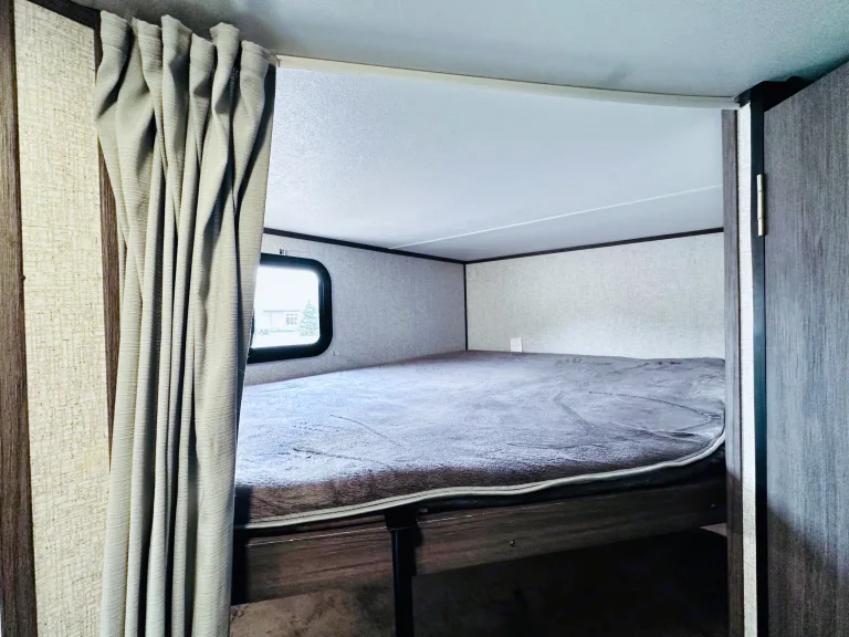 1. Cozy sleeping arrangements: This camper comfortably sleeps up to six people. The private master bedroom features a comfortable queen-size bed, while the bunk beds in the rear provide additional sleeping space for guests or children.2. Fully equipped kitchen: The well-designed kitchen includes a refrigerator, microwave, three-burner stove, oven, and a deep double-bowl sink. The ample counter space and storage cabinets allow you to prepare delicious meals with ease, while the adjacent booth dinette provides a comfortable spot for dining. Includes basic kitchen utensils and some pots and pans.3. Modern bathroom facilities: The camper features a spacious and well-appointed bathroom, complete with a shower, toilet, sink, and a vanity. With hot water readily available, you can enjoy a refreshing shower after a day of outdoor activities. Includes several clean towels.4. Entertainment options: Stay entertained during your travels with the camper's entertainment features. The living area is equipped with a high-definition smart TV, and a stereo system, so you can enjoy your favorite movies and music.5. Climate control: This camper ensures your comfort no matter the weather. The efficient heating and cooling system keeps the interior cozy or cool, allowing you to enjoy your camping adventures year-round.6. Ample storage space: The camper is designed with plenty of storage options to accommodate all your camping gear and essentials. With overhead cabinets, wardrobes, and exterior storage compartments, you'll have room for everything you need to make your trip memorable.7. Outdoor living: Extend your living space with the camper's outdoor features. The power awning provides shade and protection from the elements, allowing you to relax and enjoy the outdoor scenery. Set up a cozy outdoor dining area or simply unwind in the fresh air.8. Safety and convenience: This camper is equipped with modern safety features, including smoke detectors, carbon monoxide detectors, and fire extinguishers. The convenient power tongue jack and stabilizer jacks make setting up and leveling the camper a breeze.Autres points à signalerBefore returning camper please: