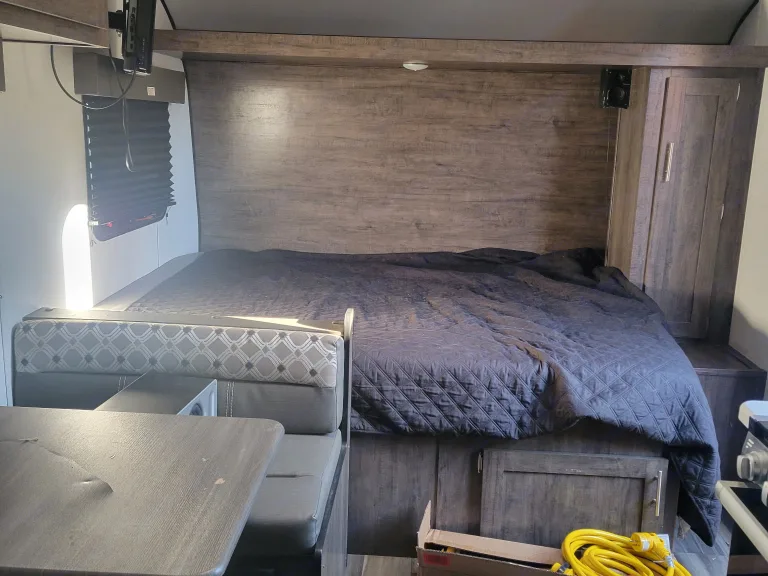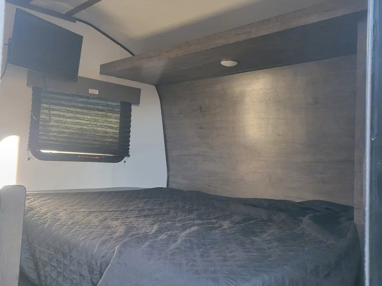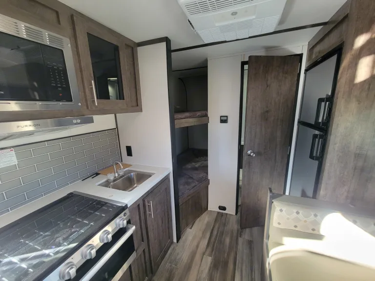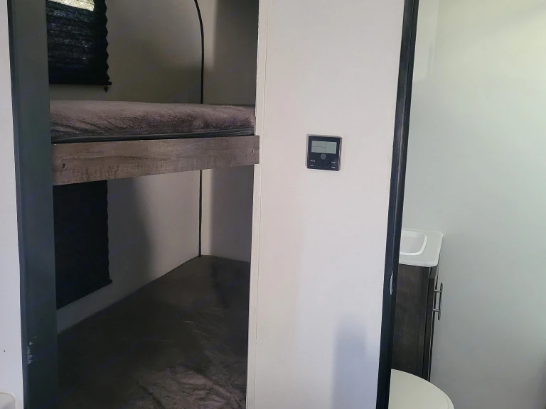 Sleeping: Front East-to-West queen bed (60x74) and rear 75-inch single-over-single bunks.