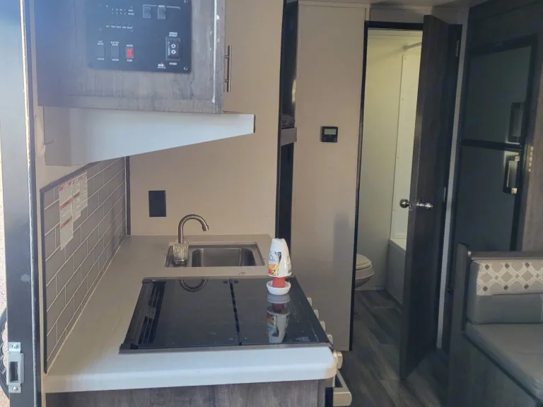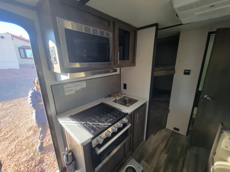 Kitchen: 3-burner range with oven, microwave, 12V or gas/electric refrigerator, and seamless countertops.