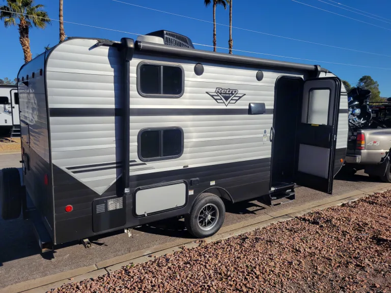 The 2022 Riverside RV Retro Series M-190BH is a 21' 10" lightweight travel trailer with a distinctive 1950s aesthetic, featuring a ~3,500 lbs dry weight, ~440 lbs hitch weight, and 940 lbs cargo capacity. It comfortably sleeps 5-6 people with a queen bed and rear bunks, featuring a full kitchen, 12V fridge, 11' awning, and a single-axle design.