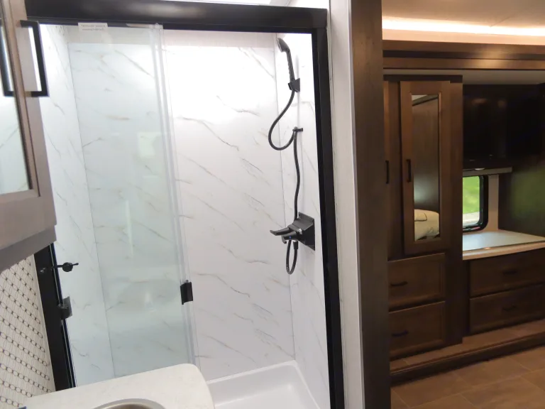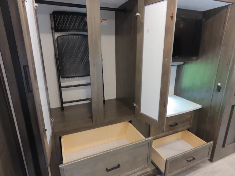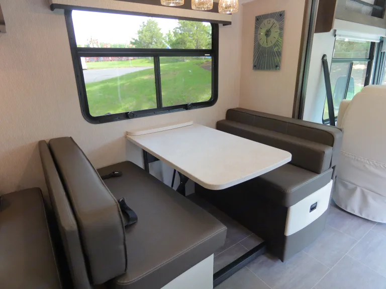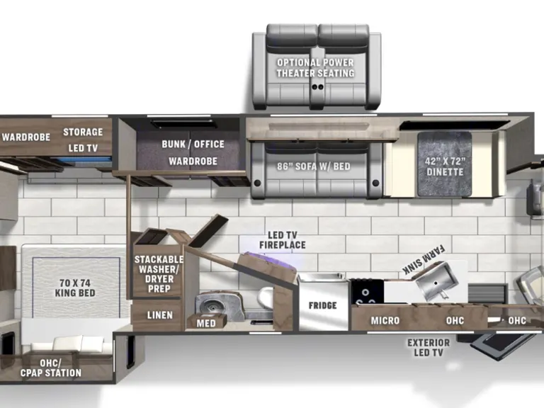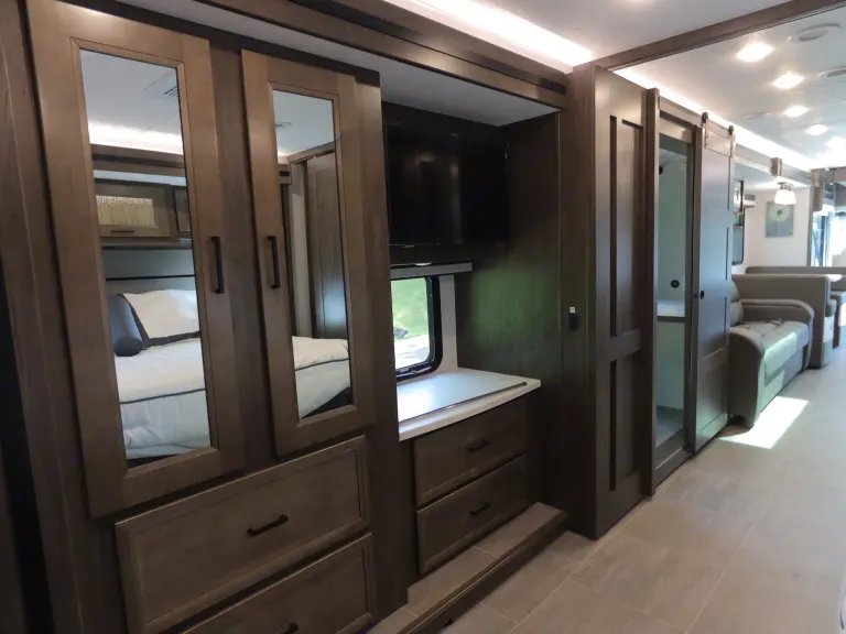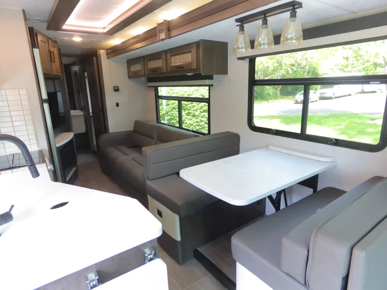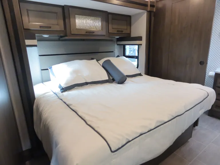 Every adventurer needs a base camp. A long day exploring and enjoying the great outdoors can wear a traveler out. That's why, when you're indoors, you deserve to relax. The Encore Class A Motorhome offers a spacious interior, complete with all the comforts of home, to let you do just that.The Encore offers the look, feel and drivability of a premium diesel machine—all without the diesel price tag. What's more, the gas-powered Encore is built for the long haul. Constructed with a fiberglass roof, 22.5" wheels, aluminum rims, and stackable washer/dryer prep, it's an unbeatable combination of power, luxury, and livability.The interior of the Encore Class A Motorhome is engineered for maximum comfort. Spacious and stacked with amenities, it has everything you need to relax and recharge. That includes stainless steel appliances, 15,000 BTU ACs, king bed, drop down cab-over bunk, and more standard features than ever before.