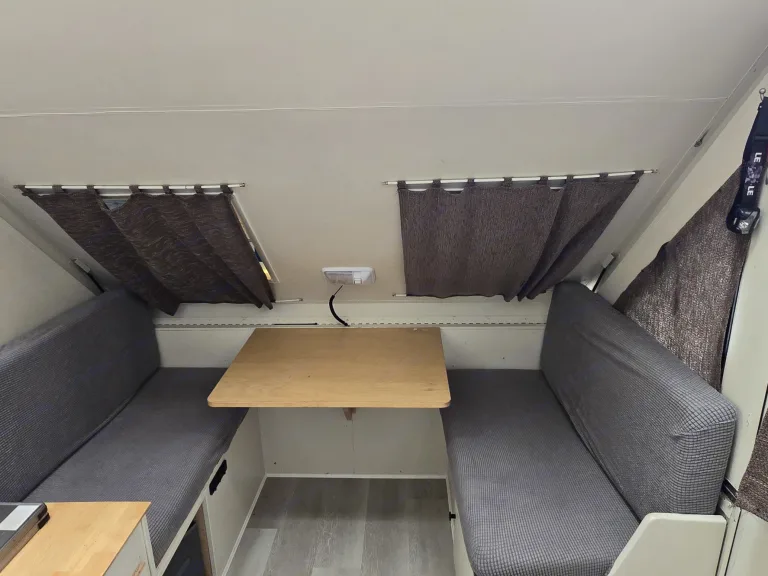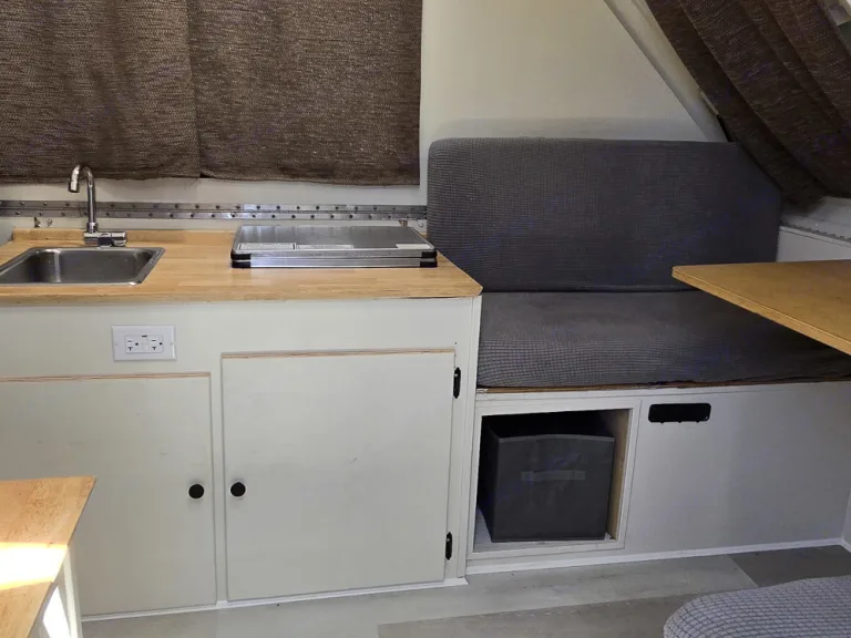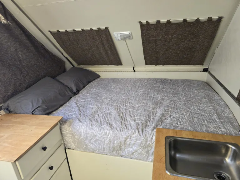 This A-Frame camper is perfect for those who've always dreamed of a unique getaway! It sets up in just a minute or two, and features hard sides, setting it apart from traditional tent trailers. Inside, you'll find a full-size bed, stove, sink, and a dinette for indoor dining. The camper is even stocked with cooking essentials and dice and card games for added fun. Its quirky charm makes it truly one-of-a-kind. Don't miss out on this incredible experience! Ce qui est inclus2 camping chairs, a small camping table, card and dice games, cookware, utensils.