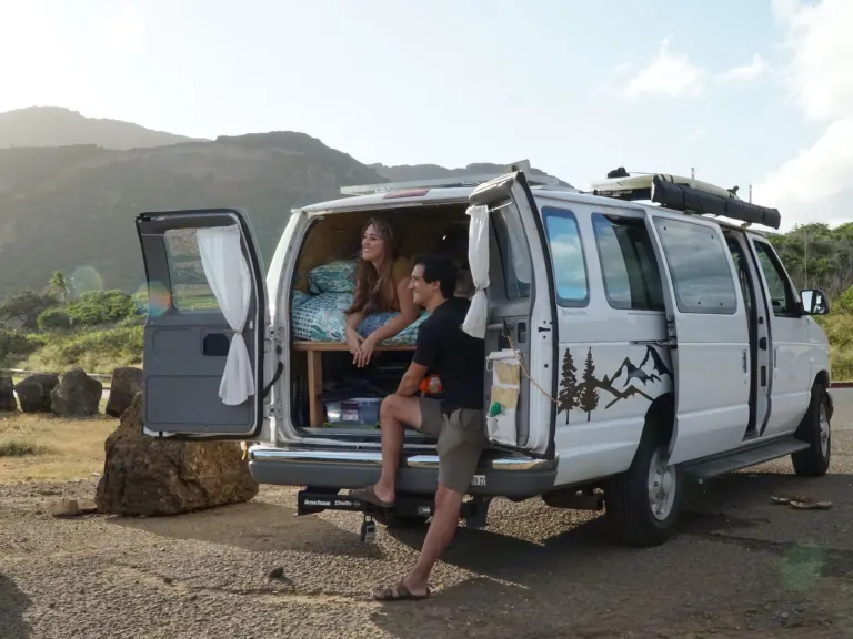 We converted our van in the spring of 2021 to travel all over the Western United States in pursuit of outdoor adventures. After driving over 30,000 miles and visiting 37 National Parks (with lots of hiking, mountain biking, paddling, and backpacking in between), we moved to Oahu and brought our beloved van with us.Our van is a well-maintained 1998 Ford Econoline E350 XLT Club Wagon (the extra-long version for more space!). It is outfitted to be a fully livable van conversion with the creature comforts necessary for extended trips on the road. In it you will find hardwood laminate floors, oiled tongue-and-groove wood paneling, a fully operational sink and outdoor shower, a chest refrigerator, a solar-powered electrical system to run all your gadgets, warm overhead lighting on dimmers, swiveling passenger seat, and plenty of storage. You can use the surf racks for your boards, the awning to get out of the sun, and the rooftop ventilation fan to keep things cool. It is the perfect vehicle to pull into a beachside campsite and have everything you need for a perfectly original Oahu vacation.We made this van to be our home away from home because we knew that the best way to see the world wasn’t from a hotel room, but by really immersing ourselves in it. We’re excited for the opportunity to share that experience with you! Mahalo nui!