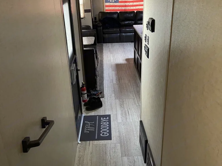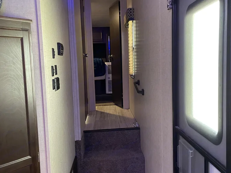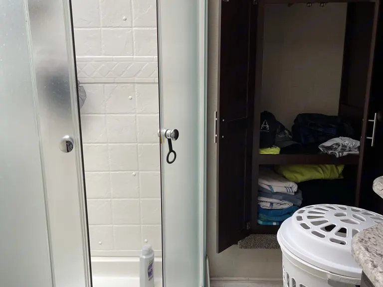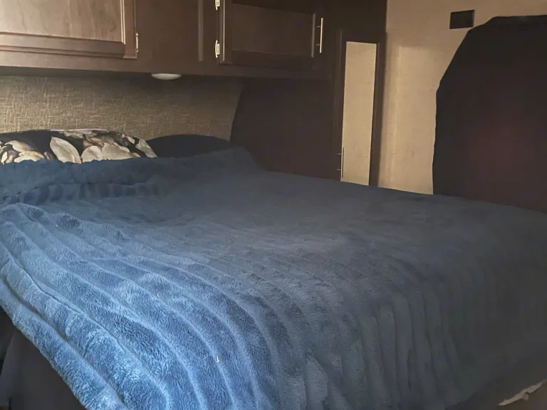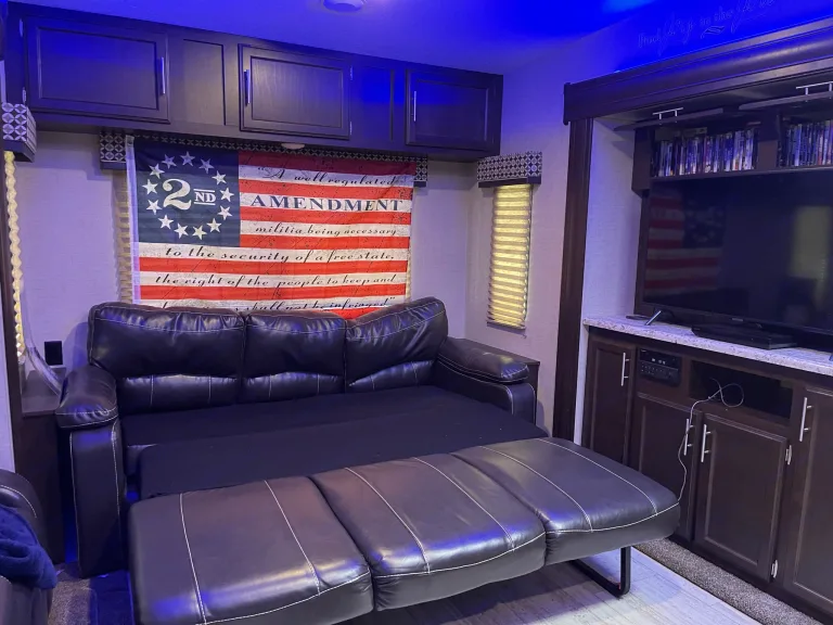 Ready to enjoy the great outdoor with all the amenities of home? Look no further this 5th wheel comes with a comfy queen in the master suite, a bunk house with a futon on bottom with a small twin over it. Kitchen with island, 3 burner stove, oven and fridge that will run off electricity or propane. Kitchen table that will seat 4 that converts into a twin bed. It also has a spacious living room with 2 theater style reclining chairs, and a couches that folds into a queen size bed. It includes pots, pans, dishes, silverware, and tupperware. Linens and blankets are included. There are a couple of camping chairs under the front. I can also include a cooler, 4 man tent upon request. This trailer is ready to add your food and hit the road!Ce qui est inclusLinens, 2x camping chairs, tents, cooler, pots, pans, dishes, and camp stove upon request.Autres points à signalerPets are allowed but with additional cleaning fee required, smoking is not allowed inside the RV.