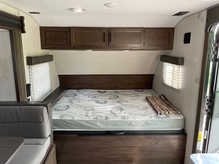 This camper is fully ready for your camping experience, from pots and pans to silverware, to bedding, just needs some friends or family, your clothes, and food.The 17JG is the embodiment of the family camper. The large U-shaped dinette offers great seating, full-size pull-out drawers, as well as additional sleeping for two adults. The master queen bed offers comfort, while housing huge under bed storage. A functional modern chef’s kitchen, and bathroom round out the interior of this class leading unit. The exterior under awning space provides ample entertaining space with the exclusive Pup kitchen, LED Power awning, exterior speakers, and TV bracket.Ce qui est inclusPots and pans, fresh bedding, toilet paper, cups, dishes, and silverware. The camper just needs personal items and food.