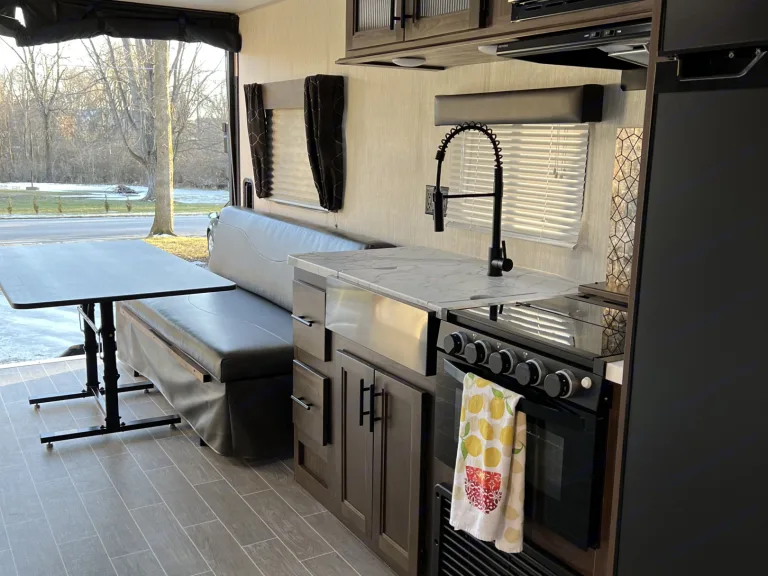 Relax and Unwind in our Toy Hauler RV! Our camper is ready for your next great adventure! Includes a bonus *Patio Party Deck* totally enclosed and elevated off the ground which allows pets and kids to feel like they are part of nature, but safe and dry! Full Rear ramp to easily load motorcycles or small atvs. Solar powered for boondocking. Generac 3800i Generator available for rent. Exterior Shower, Easy out Awning, dog tie out and surround sound speakers inside and out. 2 Smart tvs in living room and bedroom. Bedroom Smart TV can easily be moved outside to exterior mount.Our camper features all the amenities of home and is fully stocked including: Premium Queen 10" Lucid Mattress, 2 Smart Tvs with Roku, Dvd Player, Sheet and Comforter sets, Towel sets for 4, Keurig coffee maker, Toaster, Microwave, large Fridge and Freezer, Pots and Pans, Bowls, cups, paper plates and napkins, plastic cutlery, multitude of kitchen gadgetry.Features private bedroom and bathroom with enclosed shower and large toilet area. Cabinets and storage galore! Dining area sleeps an additional 2 people with convertible dining sofas. Use separately as 2 twin beds or convert to 1 King size bed.We have 5 Star reviews on RVshare, listed in Fort Wayne, Indiana from April to October each year and then we move our RVs south for the winter to Charlotte. We are super flexible and really easy to work with!Set up and Delivery is available for a fee. Ce qui est inclusOur camper features all the amenities of home and is fully stocked including: Premium Queen 10" Lucid Mattress, 2 Amazon Smart Tvs, Dvd Player, Sheet and Comforter sets, Towel sets for 4, Keurig coffee maker, Toaster, Microwave, large Fridge and Freezer, Pots and Pans, Bowls, cups, paper plates and napkins, plastic cutlery, multitude of kitchen gadgetry. Camping chairs and table. Multiple skylights and great LED lighting. Blue LED accent lights on speakers, exterior and range oven. RecommandationsIndiana DNR offers so many options here in NE Indiana. Super cheap and accessible to everyone. Usually on 26 bucks a night for an electric site and super easy to book online. We highly recommend for great family experiences the Chain O Lakes State Park, Lake Pokagon State Park, Salamonie River State Forest Family Campground and so many more! Please ask us, we deliver and set up within 110 miles of 46814 for a fee.Autres points à signalerKid and Pet approved! We have no problem with races, festivals or concerts as long as the unit is returned to us, like we sent it out!We do rent in Fort Wayne, Indiana (46814) from April to October on RVSHARE. This year we are moving the RV's to Charlotte to rent from November to March near our son. We have 5 star reviews on RVSHARE location 46814 under the same heading. Please ask if you have any questions, references available!