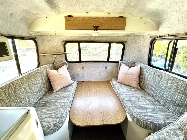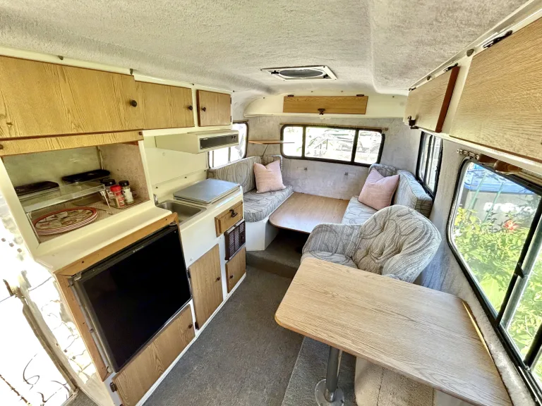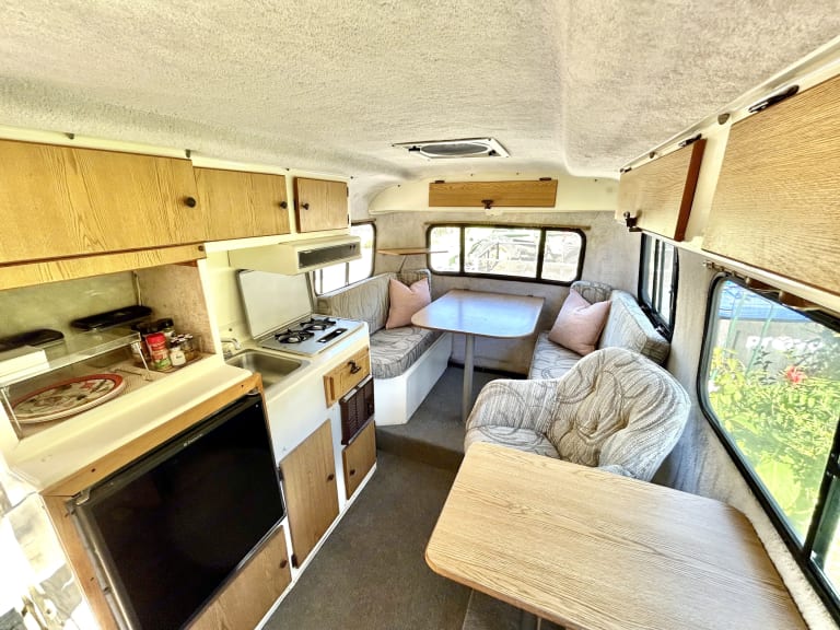 -Kitchen two-burner stovetop, refrigerator, microwave, Keurig coffee maker, and additional sink. Bed approximately full-size, and folds up into a two-bench dinette table.