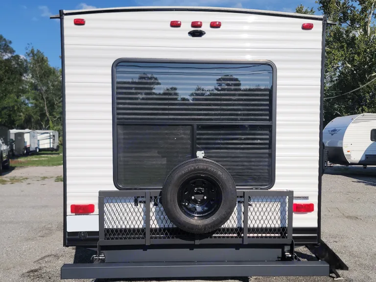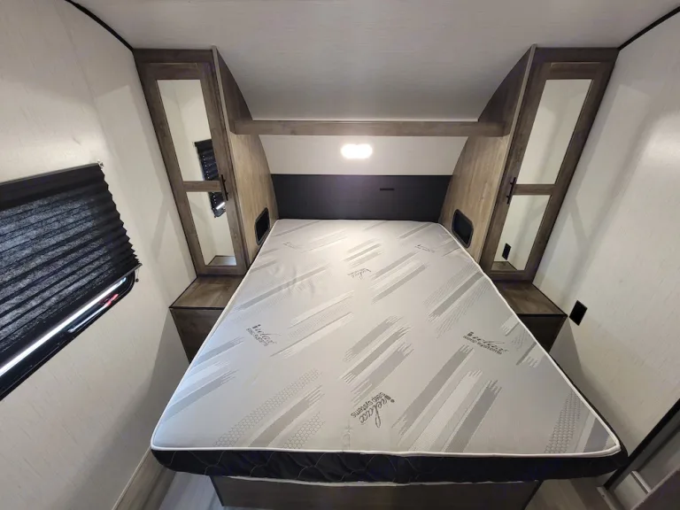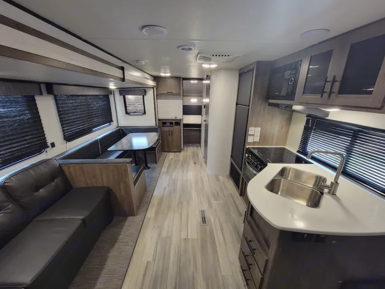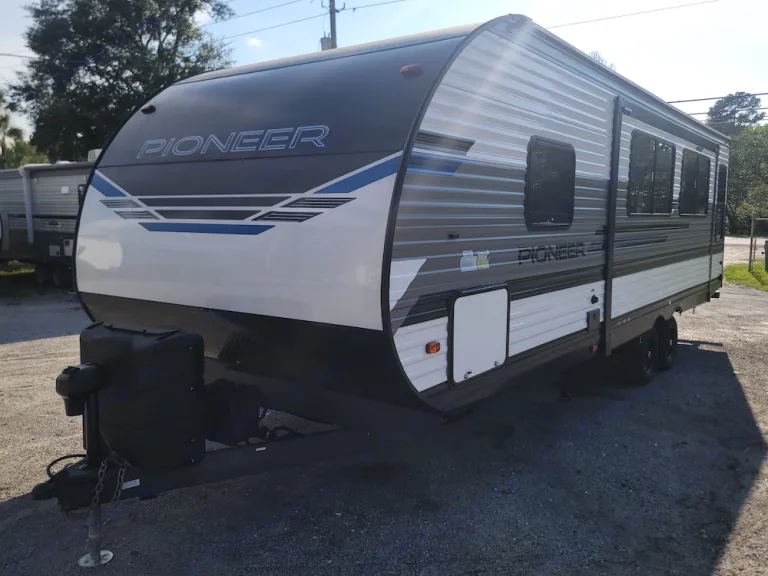 This RV is perfect for large families. This is a bunk house trailer that can sleep 6 people. This unit is 30.5 ft long and weights 6,134 lbs. The hitch weight is around 620 lbs. This unit can be towed behind Most full size pick ups.