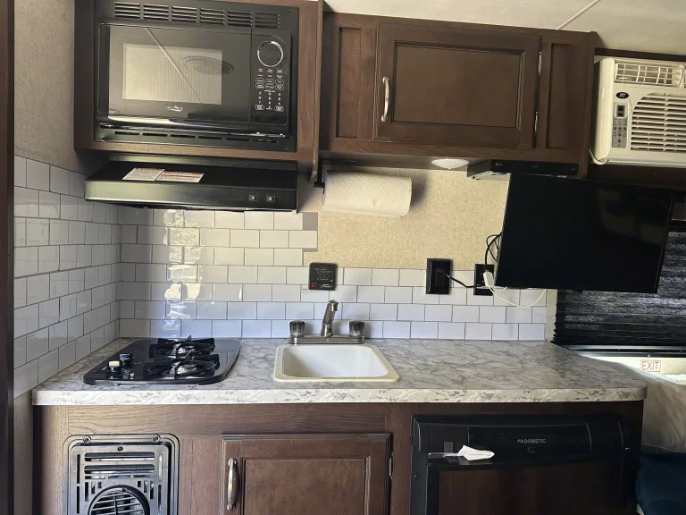 Full Kitchen: Includes a 2-burner stove, microwave, refrigerator, and a generous amount of counter space for its size.