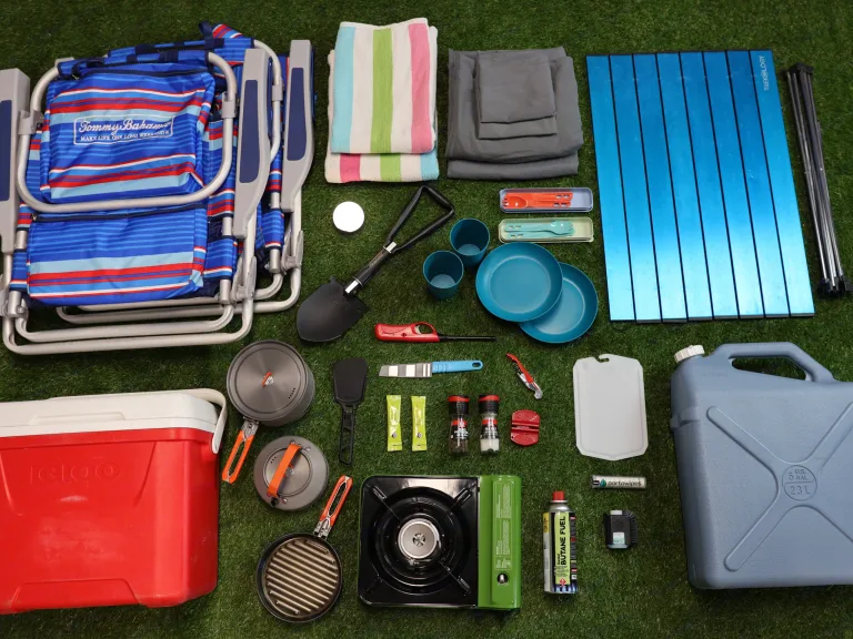 * Cooking and dining gear: table, stove with gas canister, pan, pot, kettle, spatula, knife, sharpener, cutting board, salt, pepper, oil, bottle opener, cups, plates, cutlery, dish soap, and cleaning sponge