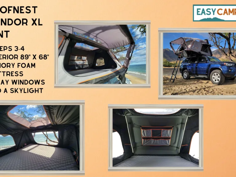 * Easy-to-set-up Roofnest camper with built-in mattress and skylight for stargazing, plus 2 pillows and 1 set of linens