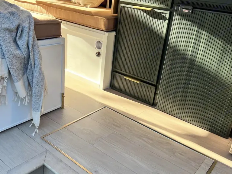 Cassette toilet, indoor pop up shower, outdoor shower and a fresh fresh water tank