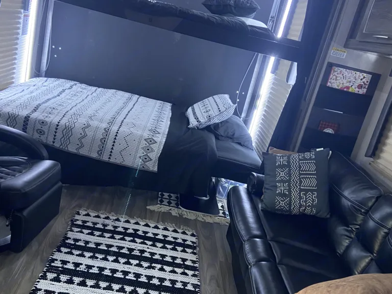 Experience the ultimate Vortex Voyager in comfort and adventure in our Fifthwheel! Perfect for families and outdoor enthusiasts, this stylish trailer sleeps up to 7 people and boasts a sleek gray and black exterior with elegant black and white decor.Designed with a family-friendly layout, our trailer ensures everyone has enough space featuring two pop outs in the living room and in the master suite giving you room to walk around the Queen size bed. Plenty of room in this trailer allowing you to relax and enjoy. Whether you’re heading out for a weekend getaway or an extended vacation, this fifthwheel offers all the comforts of home. Create unforgettable memories with your loved ones in the great outdoors!Contact us today to make this incredible Vortex Voyager your memory and embark on your next adventure!This RV is only for Delivery & Pickup within San Diego.Campsite booking details trailer length is 33ft. With two driver side pop outs. Height is 13’6” with 50amp hookups or 30amp reducer. Ce qui est inclusSleeping Arrangements: