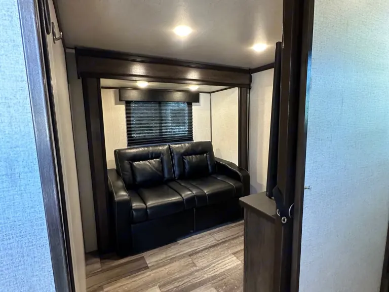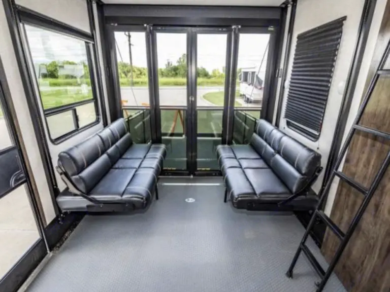Your family and friends will love camping with you in this luxury toy hauler. The most unique feature of this camper is the impressive amount of people that can sleep comfortably. There is a front master bedroom with a private access to the dual entry bath, and spacious wardrobe storage. On your way to the kitchen you'll find a middle room with a slide out sofa that converts to a double bed, plus a king sized loft above that will be perfect for additional guests. There is another twin sized loft in the living room/kitchen area. That's not all, more guests can stay in the separate garage that includes queen bunk beds, two roll-over sofas with a table, plus a half bath! That's not all, we can add a blow up tent to the patio to make it an additional room with inflatable mattresses, 2 twin or full sized mattresses would fit best. This model also features a spacious kitchen with an island peninsula, 3-seat reclining sofa, plus a table with bench seating.The 4 spacious slides provide you with space to stretch out, plus there are oversized windows to let the sun through each morning. Some of the other interior comforts you are sure to love are the pleated night shades throughout the entire coach, the stainless steel residential sized kitchen sink, the upgraded heat and massage sofas, and more. Each model includes a residential microwave, a 12 gallon water heater, plus Three upgraded A/C's to keep you cool all summer long. The Triton garage is ready to house your favorite toys or family members with 2,500 lb. tie-downs and a Tuff Ply floor, walk out gated patio with sunroom glass doors. You will also enjoy the two indoor/outdoor speakers, plus a beautiful awning for the sunny days.**IN THE Garage Patio WE CAN Install AN Enclosed Tent That Makes IT A Sealed Bedroom Apart From THE Garage. This is an add-on**Information you’ll need when making your campground reservation (you are responsible for booking the space to park the camper).