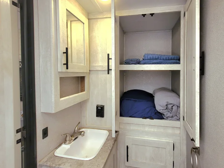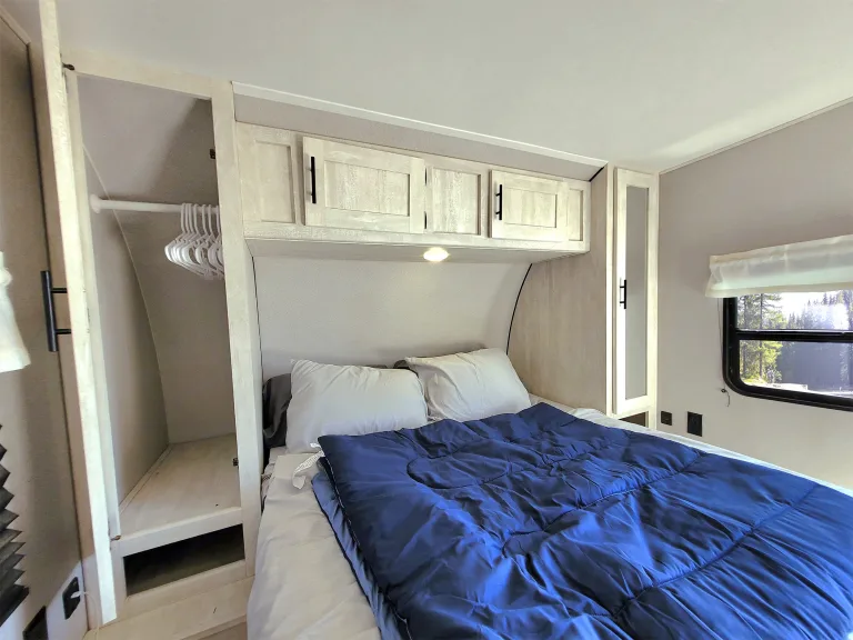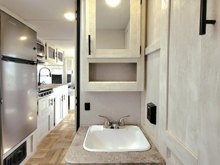 Despite its manageable length of 23 feet, our Shasta offers a surprisingly spacious interior with a width of 8 feet and a height of 10.5 feet, creating a comfortable and roomy environment. Perfect for couples or small families, it sleeps up to 4 people with a cozy queen-sized bed and a convertible sofa bed.Modern Kitchen & Living AreaThe central kitchen and living area, adorned with stylish vinyl flooring, provide a homely atmosphere.