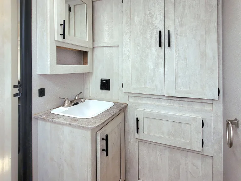 Enjoy the convenience of a rear-located bathroom, complete with a shower, plastic toilet, and a medicine cabinet.