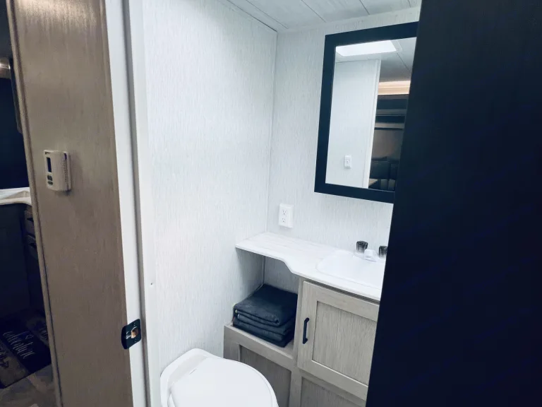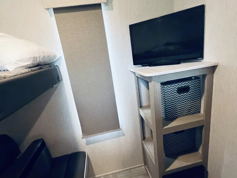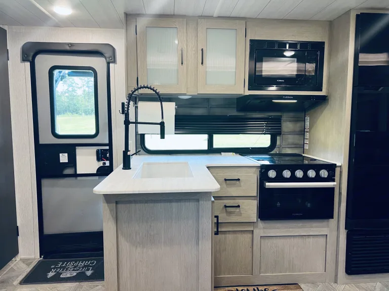 This versatile bunkhouse travel trailer is big enough for the whole family, but still light in weight by weighing in at 6,028 lbs.! The private bunkhouse has a set of 30" x 74" bunk beds and a 30" x 74" bunk bed above a Jiffy sofa. Just outside the bunkhouse is a pantry big enough to store everyone's favorite snacks, and a full bathroom with a walk-in shower. The three burner cooktop is just waiting for you to create a delicious meal, and the U-shaped dinette welcomes everyone to enjoy each meal in comfort, plus there is a large panoramic window for a perfect view of your surroundings. Any time of day kick back on the Versa-lounge and relax by the fireplace at the entertainment center. The exterior features a pass-through storage area for you to keep your outdoor camping gear stowed away when not in use, a 16' power awning to protect you, and an exterior camp kitchen!