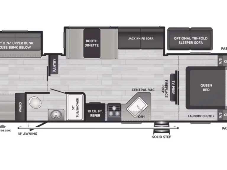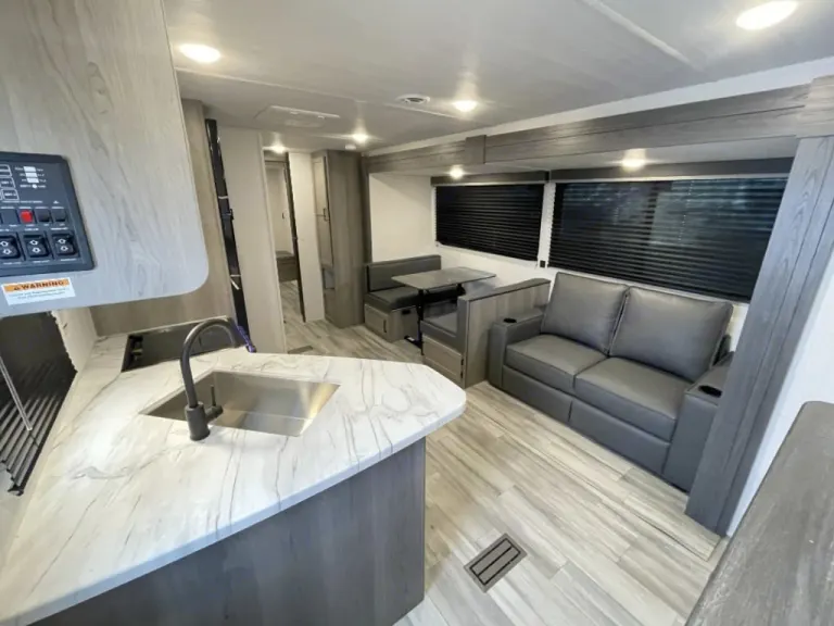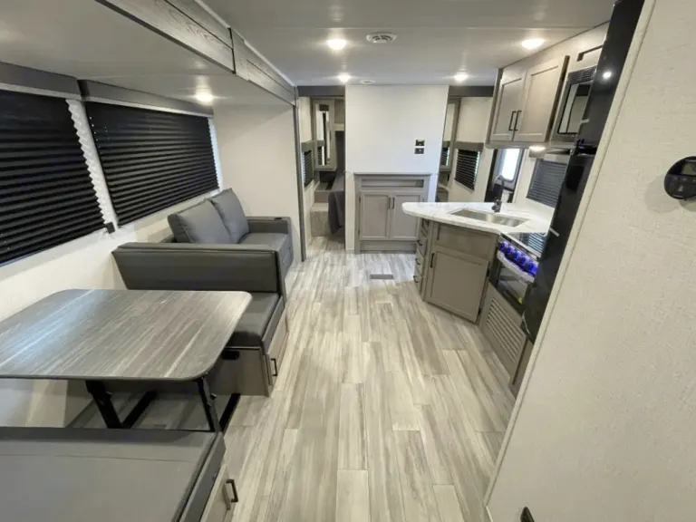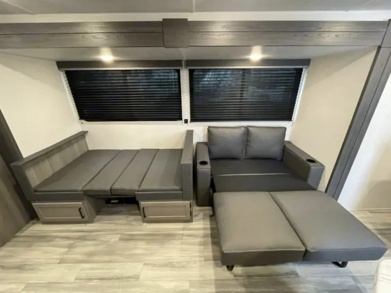 This camper is available for delivery only with an additional charge. This includes setup and pickup.Perfect for a family/friend getaway! We will deliver and setup for you. Fully stocked with fitted sheets, dishes, cookware, silverware, and an outdoor gas grill and outdoor kitchen. Everything you need to get your vacation underway! Sleeps up to 9 comfortably. 2 queen size beds and a full size bunkhouse with 4 bunks! A dining room table that converts to a bed. A luxurious 2 seater leather sofa for relaxing. Our Travel Trailer is a 36-foot, camper with two full slide outs. Appliances are fridge, freezer, air conditioner, furnace, propane stove and oven. See the pictures! Please note we only deliver the camper within a 150 mile radius for a charge of up to $250. This includes setup and pickup. Additional charges will apply if delivering over 150 miles and must be pre-approved before booking.Ce qui est inclus• Fitted sheets