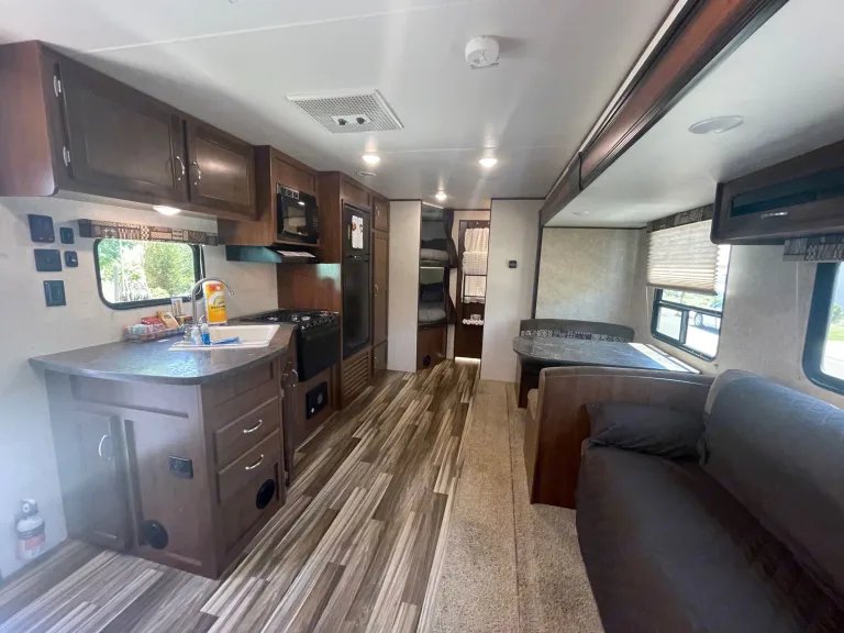 Broom, axe, hammer, hosesCheck out the Add-On’s.RecommandationsProvide your own kitchen/cleaning supplies, and any other necessities, while using the travel trailer. Feel free to use what’s available.You will need to purchase and bring any extra RV toilet paper, in excess of the 4 rolls provided. Do not flush anything down the toilet except for RV toilet paper.DO NOT put any food down the kitchen sink.Please review Dump Tanks and Refill Propane Tanks rules.Autres points à signalerMinimum of 3 night stay. Renter must provide a copy of a Valid Drivers License.A deep sanitary cleaning will be done upon every return. A cleaning fee of $150 is required.Pets are welcome with an additional fee of $15/day.No smoking allowed inside.PRIOR TO YOUR DEPARTURE:Upon departure of your camp site, the awning and slide out must be completely closed, securely and properly, or a $500 fee will be charged. This is a REQUIREMENT upon departure as it can cause damage to the travel trailer if driven with it open at any degree.Please also make sure all interior lights, bathroom fan, vent, a/c or heater are turned off and the main switch inside is turned off. Please make sure the door and all storage compartments below are locked. It is also very important (safety issue) that both of the propane tanks are closed prior to hauling the travel trailer.