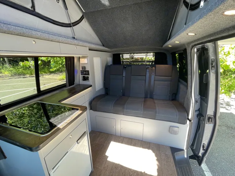 This camper takes the traditional narrow kitchen conversion and elevates it to new levels of luxury. Running the length of the driver's side of the vehicle is the kitchen and storage units. Sleek and subtle, the cupboards feature a soft-close drawer system with deep storage areas. The kitchen also features a sink with Cold water, one ring hob unit, 50 ltr fridge.The rear RIB seat/bed system is the best in the industry and offers sculpted, comfortable seats for relaxing and dining. In the evenings, however, it folds into a completely flat two-berth bed in just two smooth and easy movements.